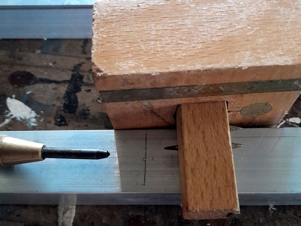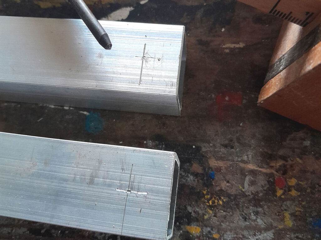 5. I began with the two feet, using a centre punch and a gauge to set the point for the foot 8mmØ pivot bolts at 12.5mm in from the one end and centred on the extrusion centreline (the extrusion being 25mm on each side).