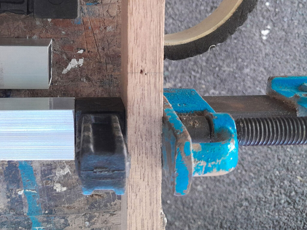 In this case, the square-section aluminium extrusion lengths were cut to 750mm each, leaving 250mm (less the width of the cutting saw’s blade) for the swivelling feet.