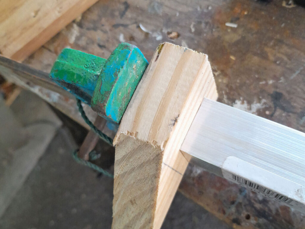 4. I decided to use the good old hacksaw to cut the pieces, and to keep the blade vertical for a more accurate cut, made up this ‘mitre guide’.