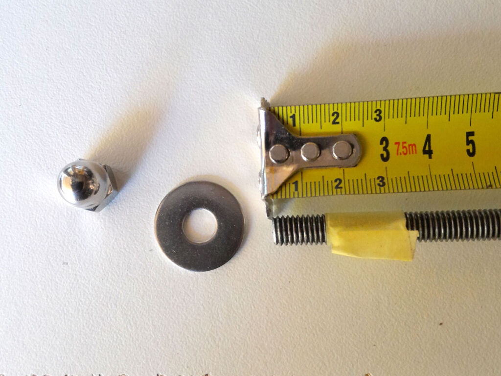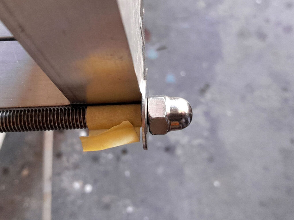 5. Cut the rod to length, and then the tube as well, allowing for a washer on each side, then slide the threaded rod over the tube, fit the washers on to the end of the tube, then screw down the dome nuts. This shows the outer view…