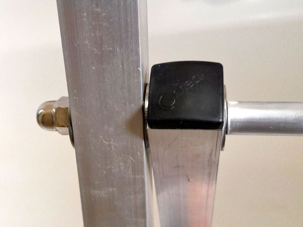 3. Here is another view showing the end of the tube meets the washer. This now explains why you cut the threaded rod slightly longer… with the dome nuts at each end fully seated, there is a little play so the feet can be swung into position without undue strain… they should not be absolutely locked in place, but have some freedom of movement – for obvious reasons.