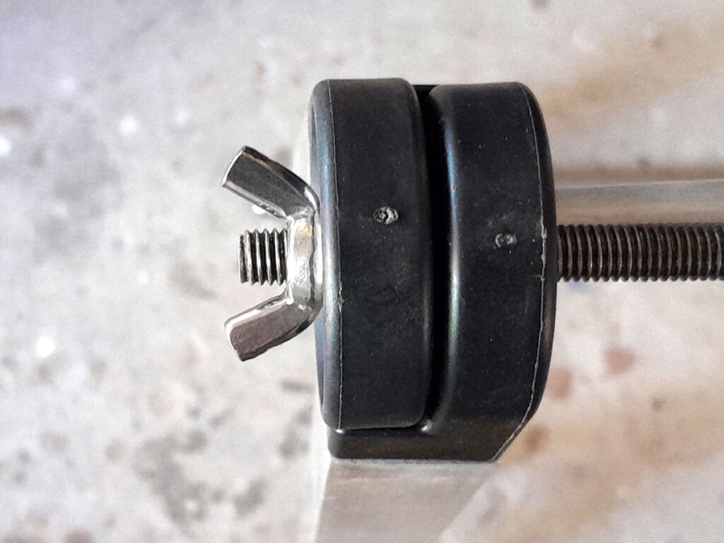 5. Then I used the bar clamp as before, so seat the swivel hinges on the ends of the uprights, and using the same method as before, cut the threaded rod to length. Note that first I set the one end just shy of the wing nut wings.