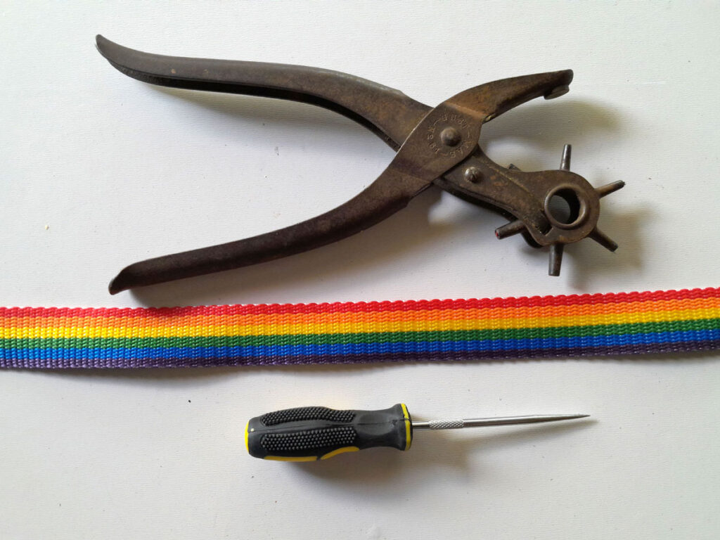 3. To make the holes for the rivets, you can use either a punch (top), but ensure that you select a hole size that will fit the rivet very snugly… too large and the rivet will not have the required grip. Obviously, the punch actually cuts through the strap material. Or you could use an awl. This will not cut through the strap fabric, but will simply spread it. (Some might even try using a nail, if they do not have either of the above available.)