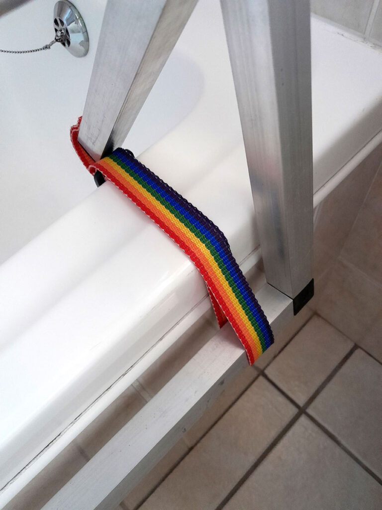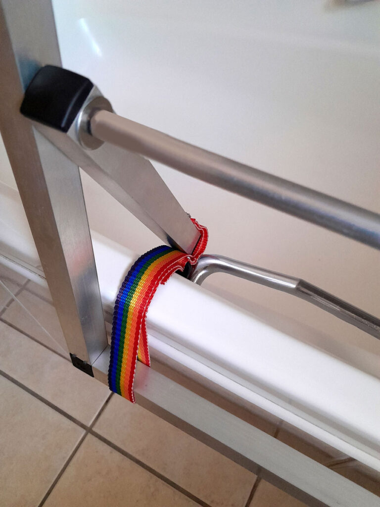 2. And here is where the strap adjustment comes in handy… this part of the bath’s rim narrows to accommodate a handle, so you can adjust the strap if necessary to level the rack, as the foot on the other side…