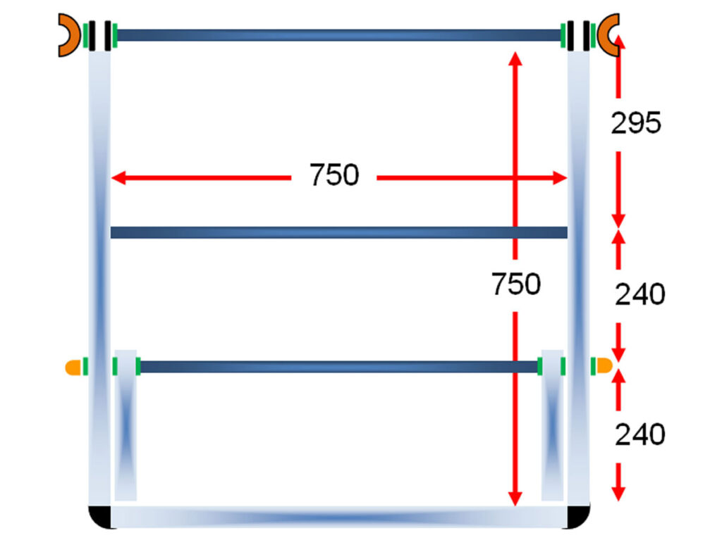 1. I marked the positions of the rails at 240mm intervals, with the top rail – slipped over the top threaded rod acting as an axle for the hinges, being 295mm above the middle rail. (See illustration.)