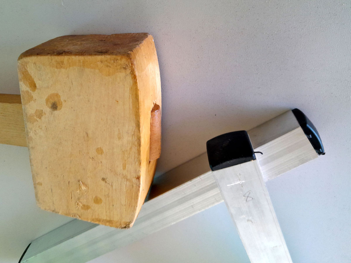 2. These are the two feet, with their male end caps tapped into place. Don’t use a claw hammer or similar, but rather a wooden mallet, as shown here, or a rubber mallet.