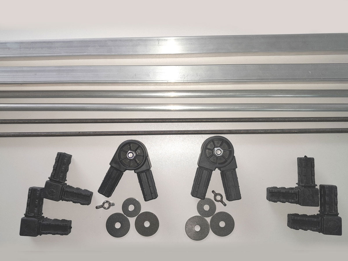 Cordless or mains drill/driver, hacksaw (or mitre saw fitted with a blade to cut aluminium), automatic centre punch (or centre punch*), hammer, spanners, tube cutter, mini blowtorch or lighter, scissors able to handle straps, fabric punch or awl, wooden or rubber mallet (but preferably a bar clamp of sufficient length to seat the corner connectors and swivel connectors in the 25mm extrusions.