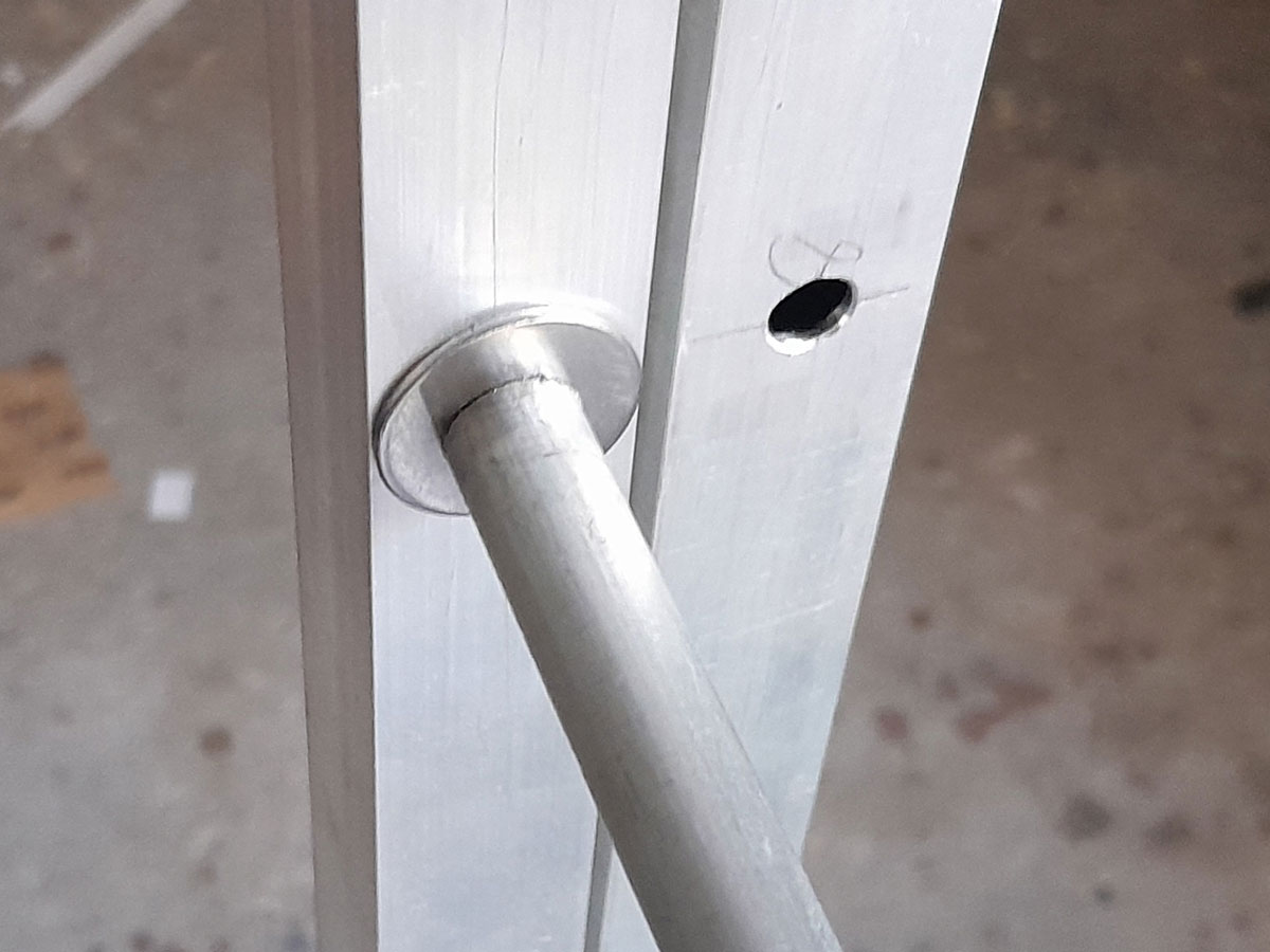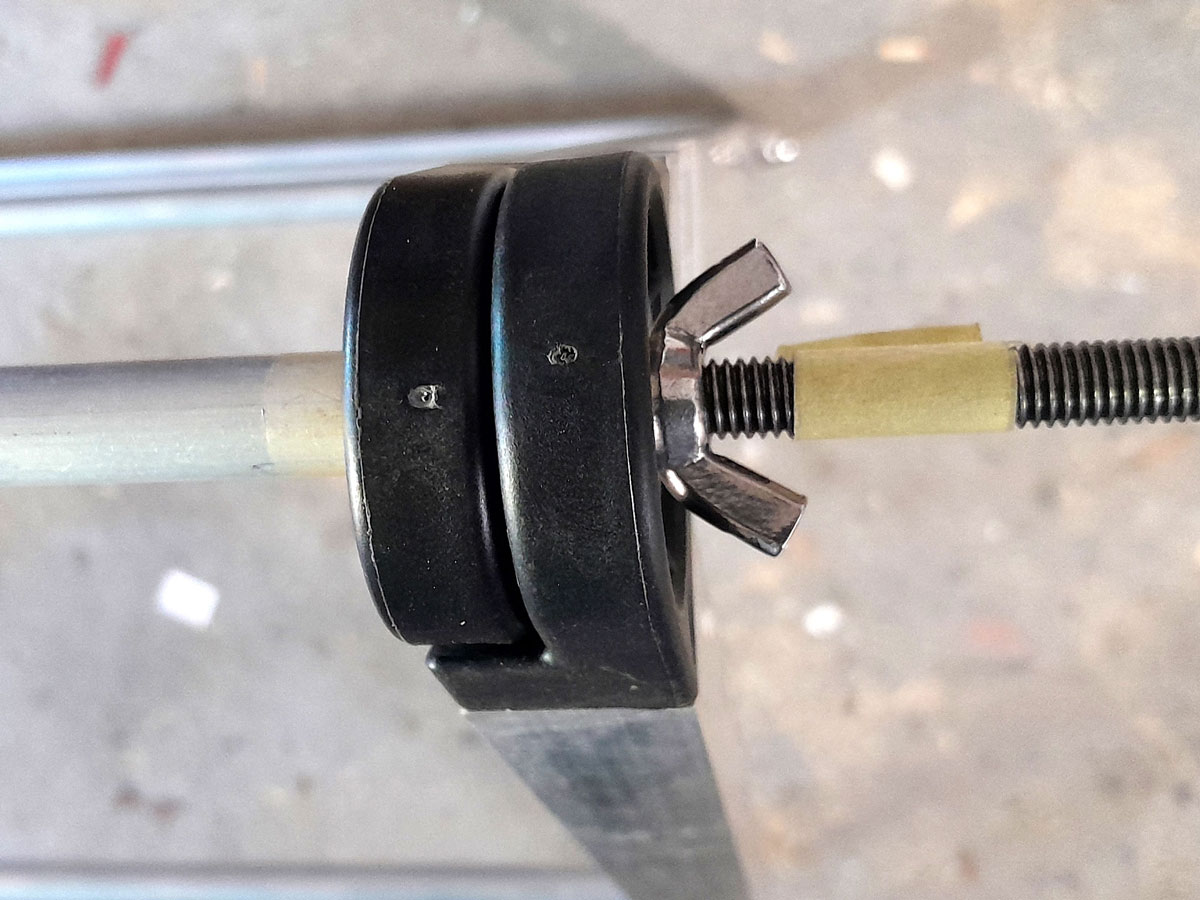 5. Cut the rod to length, and then the tube as well, allowing for a washer on each side, then slide the threaded rod over the tube, fit the washers on to the end of the tube, then screw down the dome nuts. This shows the outer view…