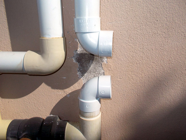 - The completed fix. This method will work on any pipe installation where the leak or fault position means that the ends of the pipes cannot be separated, but it is important to do it in the sequence as shown here – with the flat ‘U’ going on last; if you make up the whole unit with all four elbows and then try to fit it on to the cut ends of the existing pipes, you will be back to square 1.