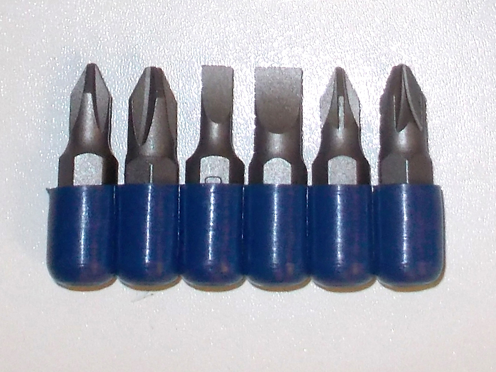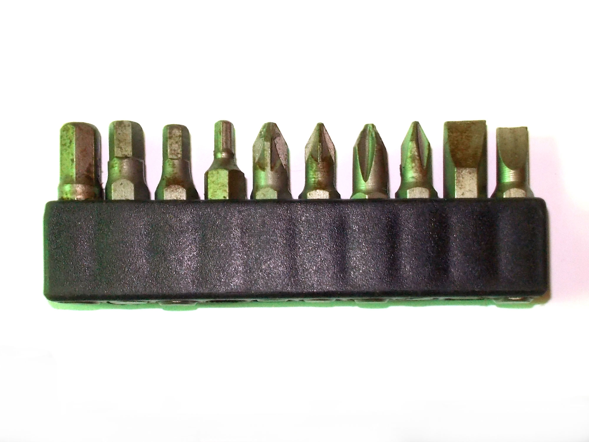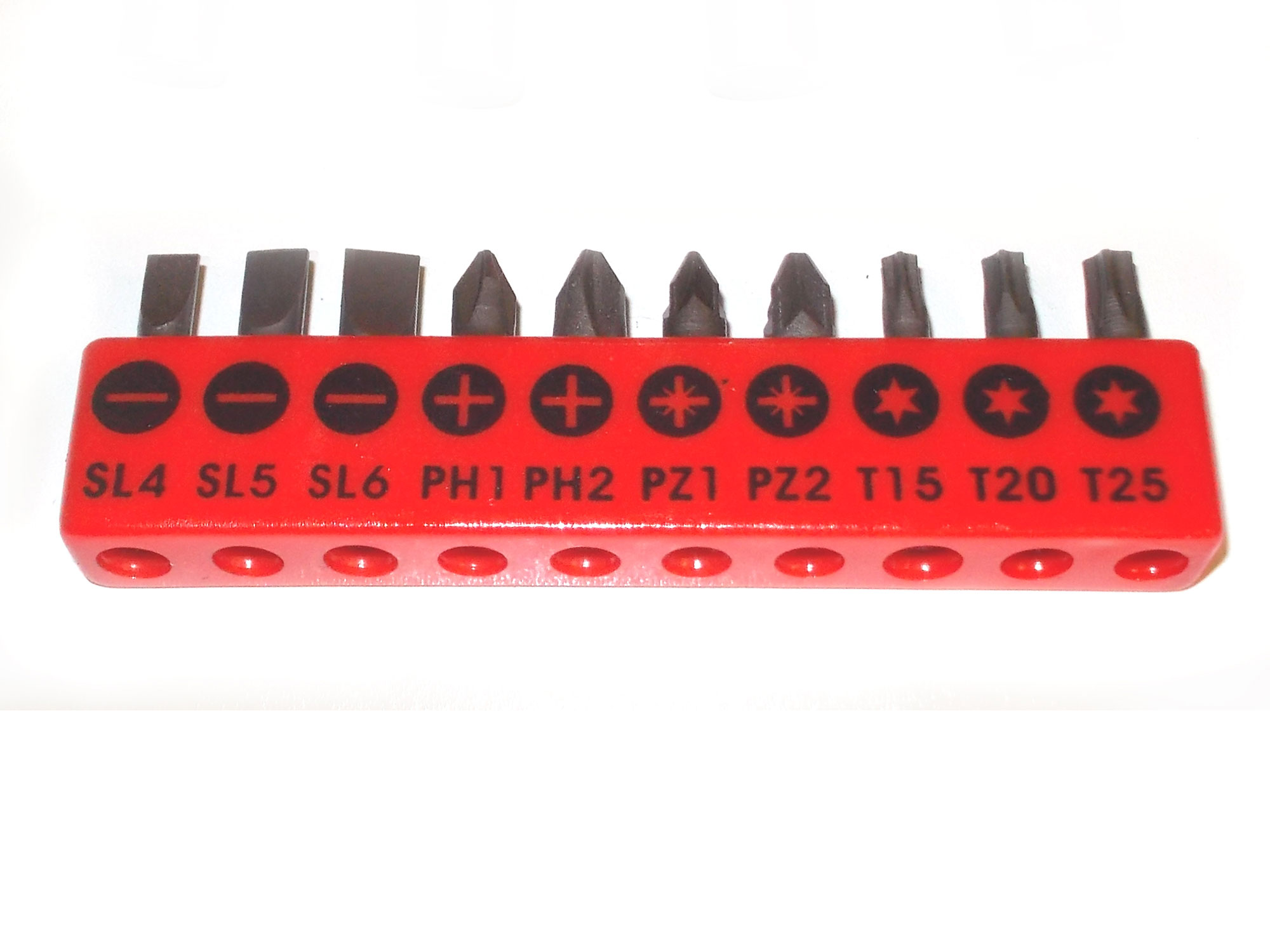 - First we will look at a variety of bits designed for working with screws. This set (L-R) comprises three slot (or flat), two Phillips, two Pozi and three Torx. They are all 6.24mm hex shanks.