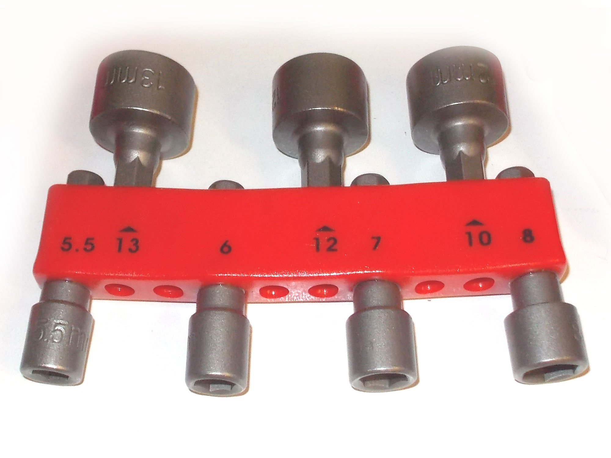 - A set of seven nutsetters. These are power tool accessories designed to fasten metal and self-tapping screws. Shown here is a small set. The bottom row (L-R) 5.5mm, 6mm, 7mm and 8mm, with (R-L) 10mm, 12mm and 13mm at the top.