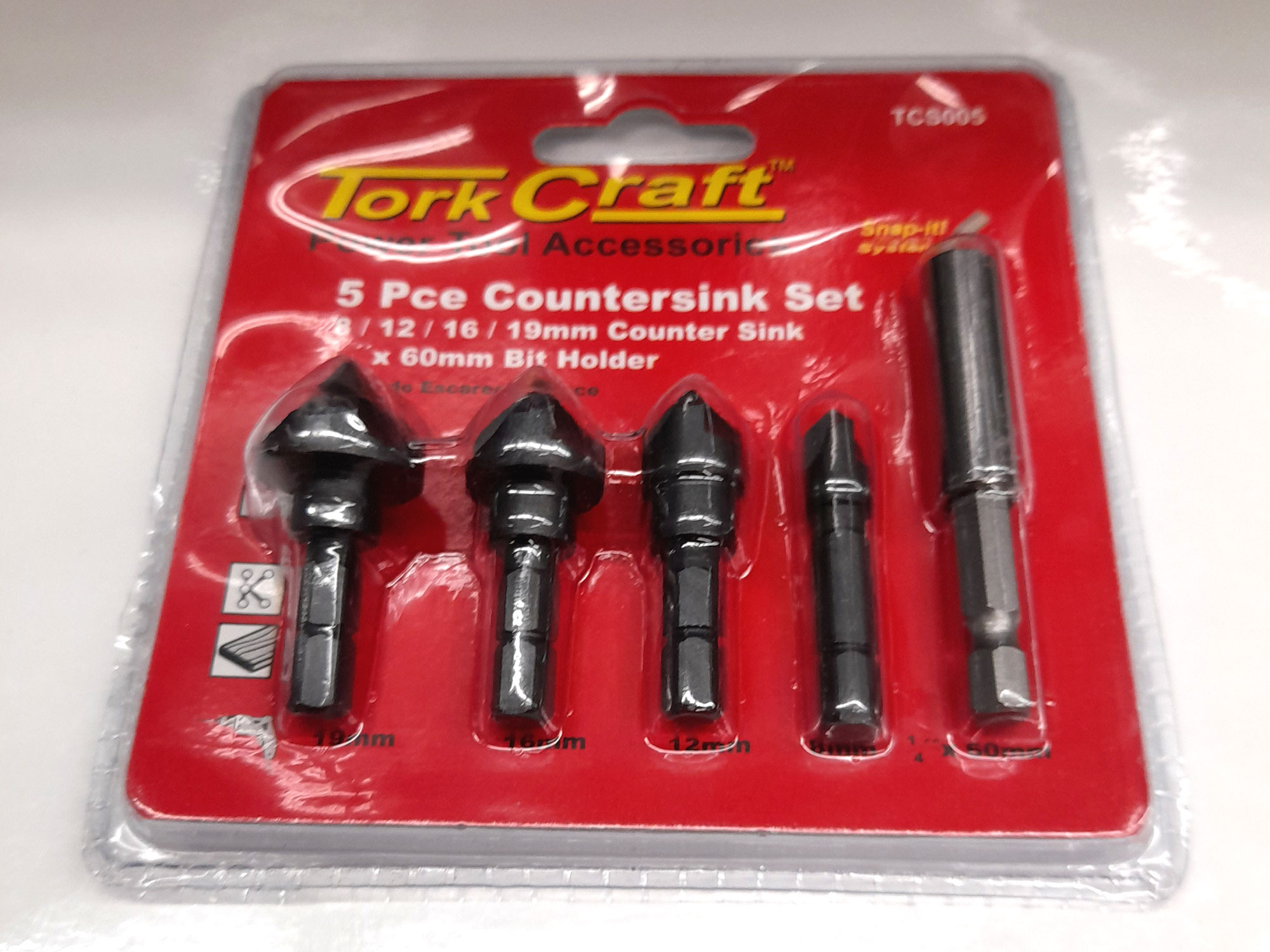 - A set of countersink bits – 8mm, 12mm, 16mm and 19mm plus a magnetic bit holder 60mm long. Again, the latter allows for a quick change between countersinking the screw hole and then substituting the countersink bit for the driver bit.