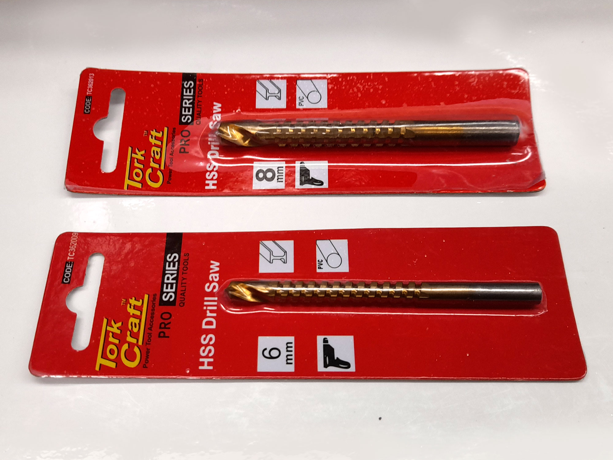 - Two examples of drill saws – a 6mmØ and 8mmØ for use on metals and can also be used on PVC.