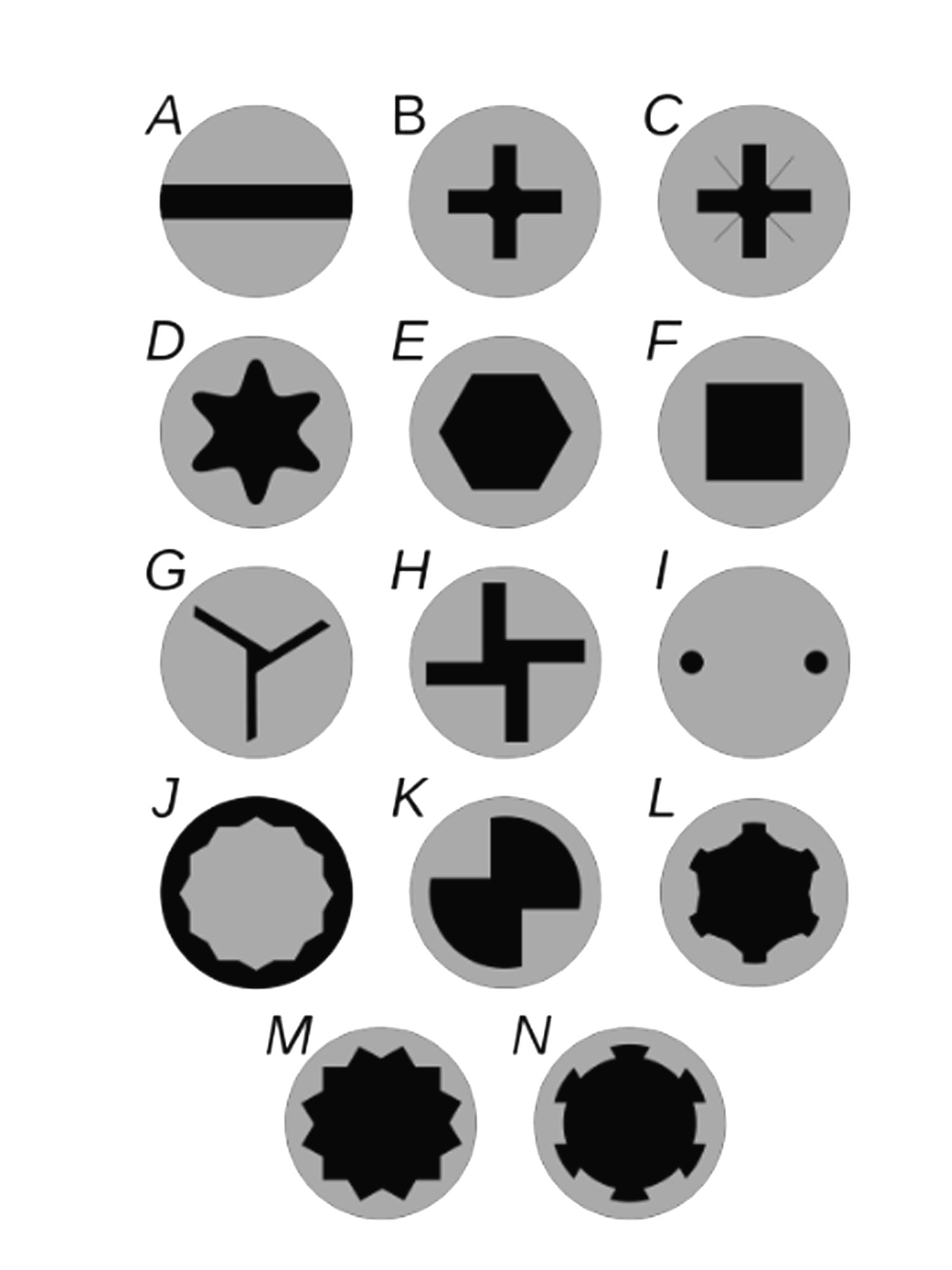 - Screw drives: There are many screw drives but here we are going to deal with just those that you might come across during your work at your Mica store. A – Slot – requires a Flat Tip; B – Phillips; C – Pozi; D – Torx; E – Hex Socket; F – Robertson or Square; G – Tri-Wing; H – Torq-Set; I – Spanner Head; J – Spline Drive; K – One Way; L – Poly Drive; M – Triple Square; N – Bristol.