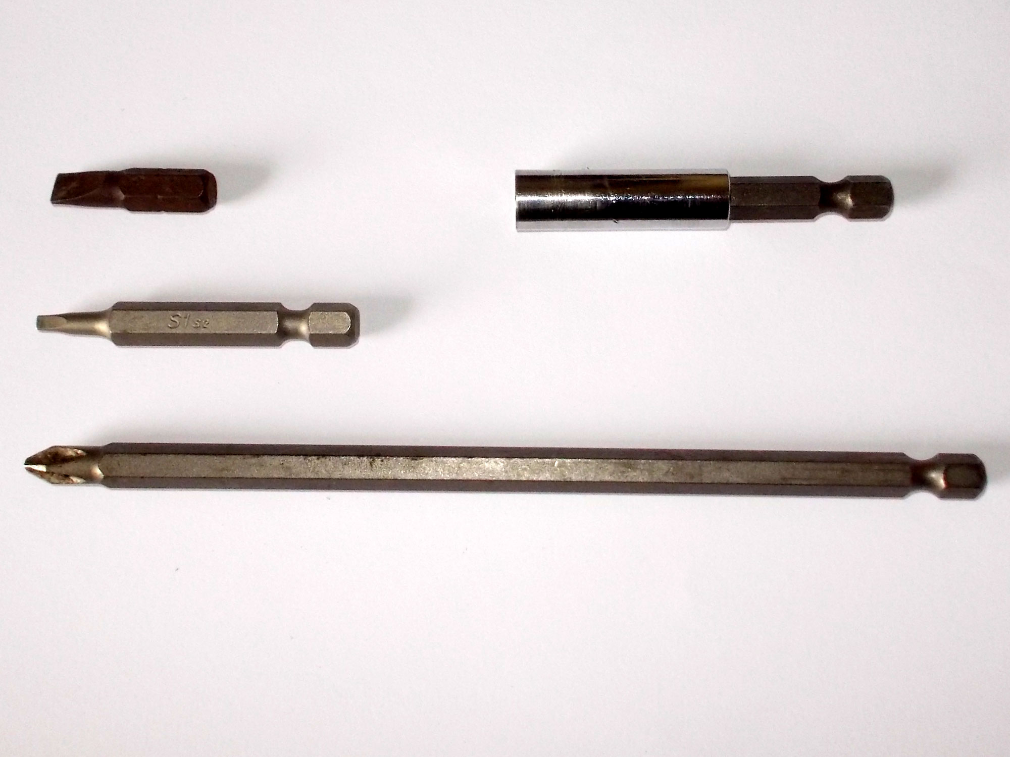 - A note about hex shank sizes: Hex shank sizes vary and are measured across the flats – in other words, from one flat face to the parallel flat face directly opposite. In this image the 9.25mm (3/8 inch) bit at the top is used in conjunction with an impact screwdriver. The 6.25mm (1/4 inch) (second from the top) is the most common size and used in a wide variety of applications – screwdriver bits, and various drill bits, for example, while the smaller versions at the bottom of the image are usually on the packaging shown as 4.74mm (3/16 inch), and are used for very fine work, for example being used with bits with flat tips down to 1.5mm or so.