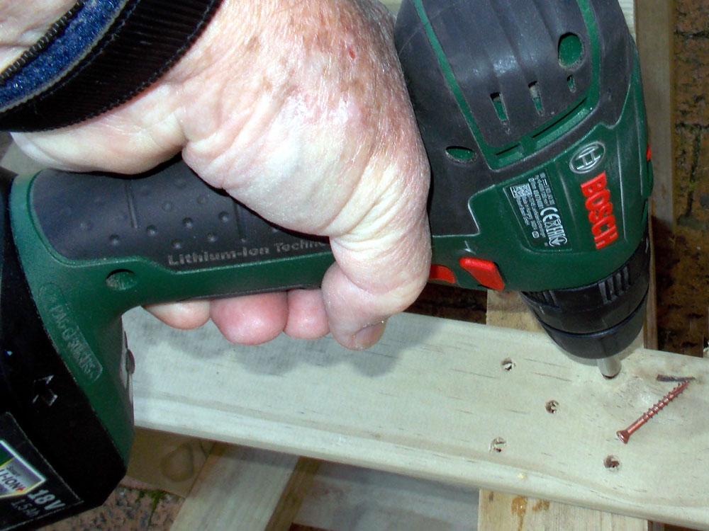 - Having attached the top of the legs to the top strut, we attached the main strut to the legs at a height of 250mm, using five 40mm decking screws to secure the join, as shown here.