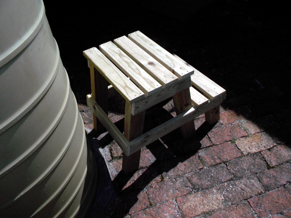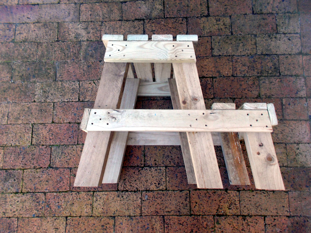 - Here you can see the two lower step slats (space 22mm apart and 22mm from the rear legs, and the front cross-brace, flush with the top edge of the step.