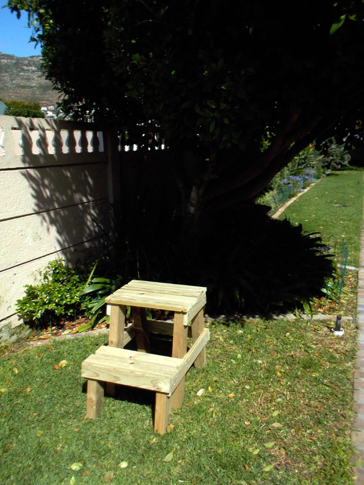 - The best way to make this 2-step/platform is to assemble one set of legs and then use them as the template for the second set. That will ensure they are identical. Then it is simply a case of attaching the two sets together by means of the two 22x69x450mm step slats, the four platform slats, and last the two 450mm cross-braces, the one attached to the step legs also serving to make the lower step just a little deeper – only by 22mm, but it helps. The four slats for the top platform are spaced about 16mm apart, to provide a total width of 450mm and total depth of 330mm
