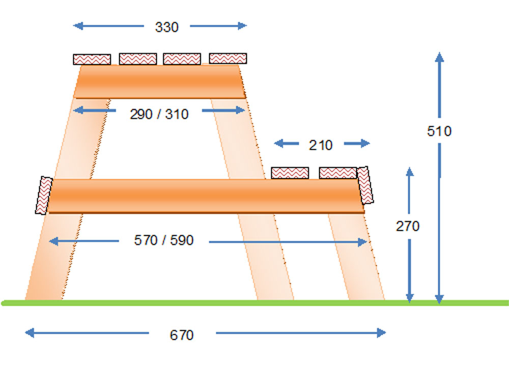 - Cutting the two top struts from 22x69mm timber – each 290mm long along the top edge and 310mm long at the base (see illustration) and two bottom struts, each 570mm top edge and 590mm bottom edge.