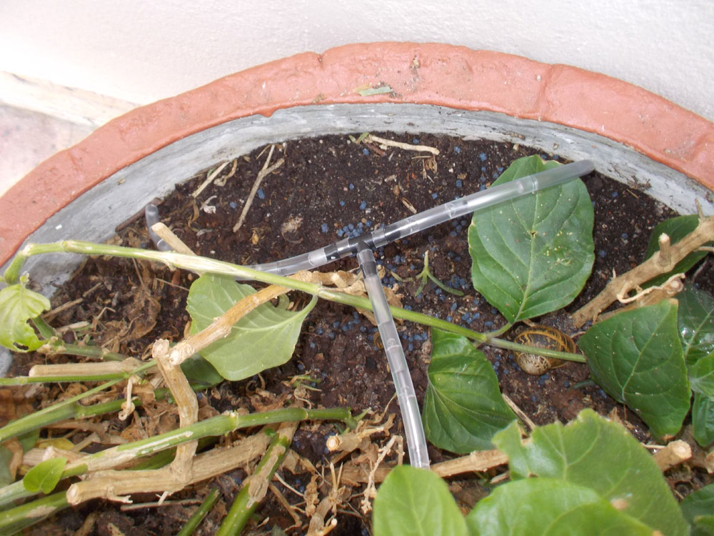 - We cut the tubing at a suitable point so that it would easily reach the pot plant and cut the remaining tube into six equal lengths of about 150mm each. Then we connected them to the end of the tube as shown in the image. The idea is to be able to apply water to a wider area in the pot – in the case with four outlets – rather than simply placing the end in the pot, in which case only one area would be watered.
