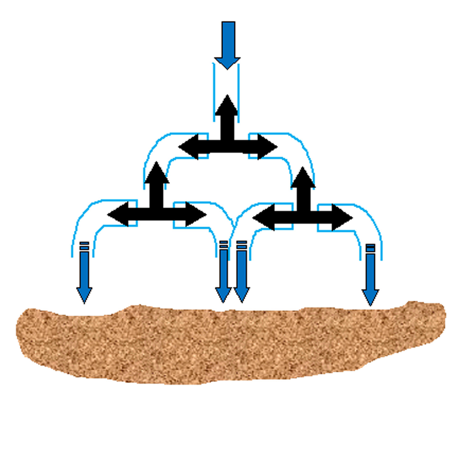 - This illustration further illustrates the outlet branches and how four of them distribute the overflow water to farm more of the root system than would a single outlet.