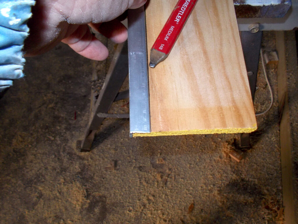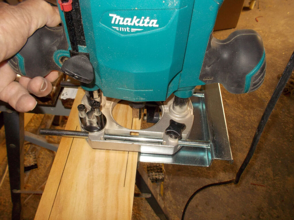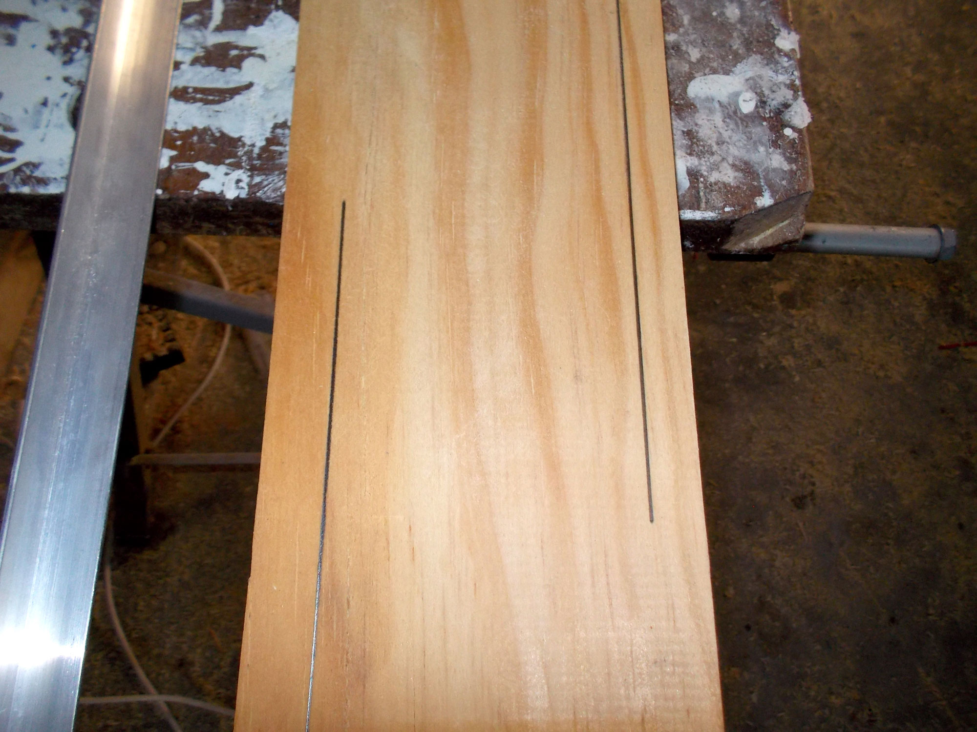 Now for the crafty part… routing the recesses in the side pieces for the aluminium angle. You need to do this because if you do not, when the sides are glued to the legs, there will be no gap for the aluminium angle to slide into. So, first of all, holding the angle hard against the edge, mark off the routing line. This being the full depth of the extrusion’s arm will be for the bottom ledge of the sides.