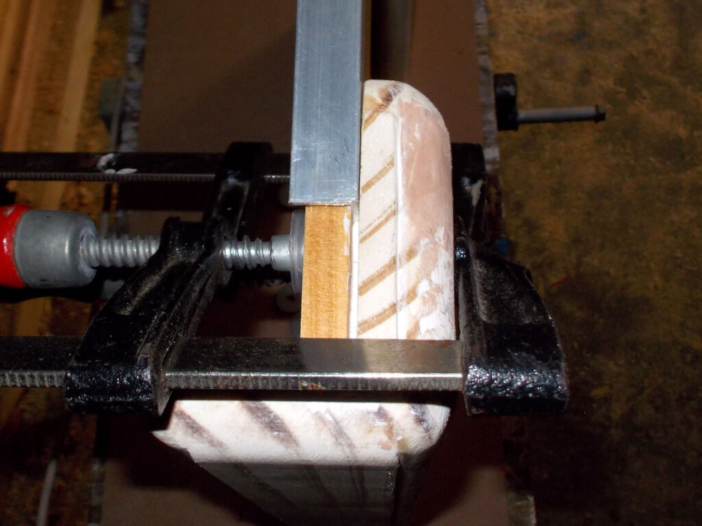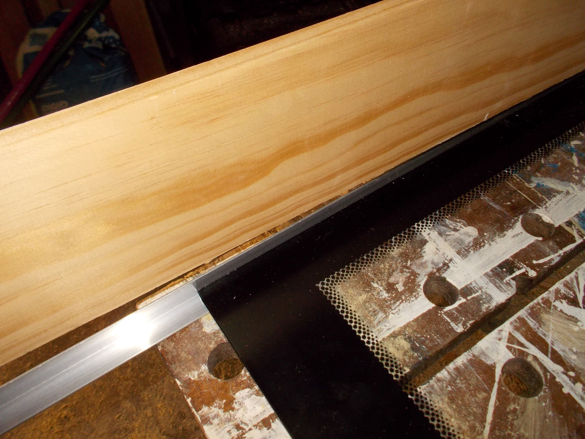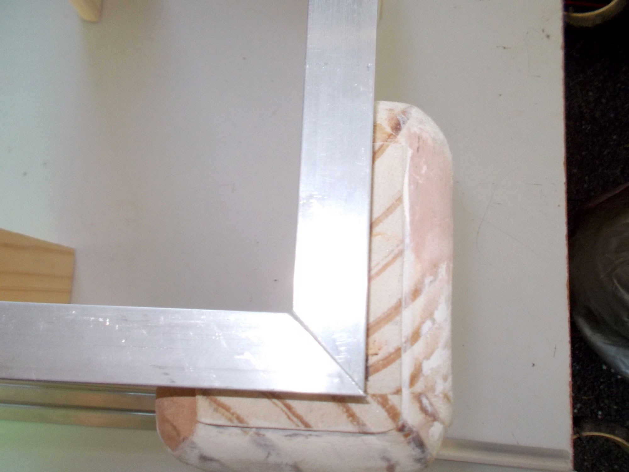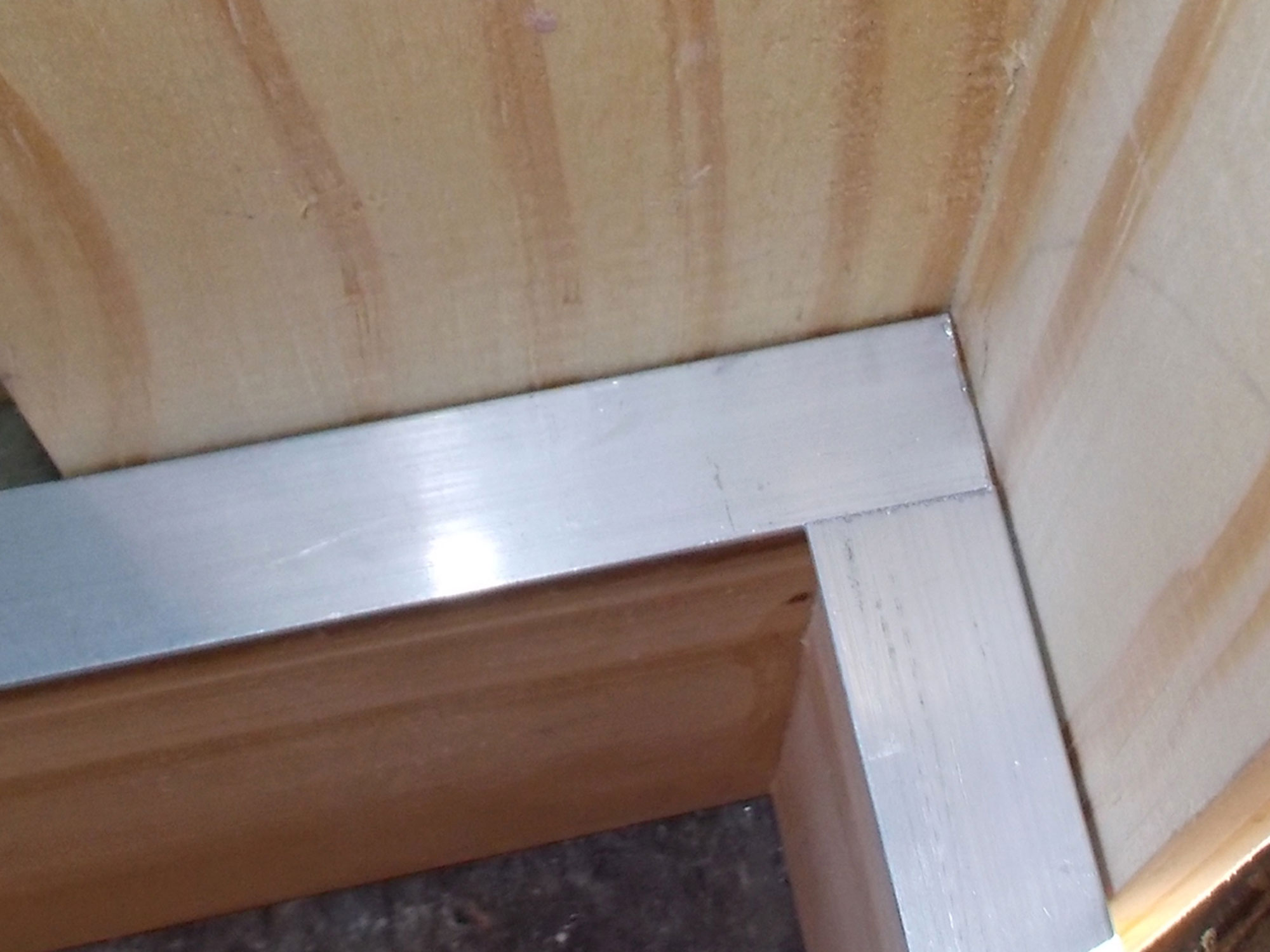 Here is the aluminium angle being checked for fit on the top, glass surround, edge of the side. Note the gap between the inner edge of the extrusion, and the timber – this allows space for the glass.