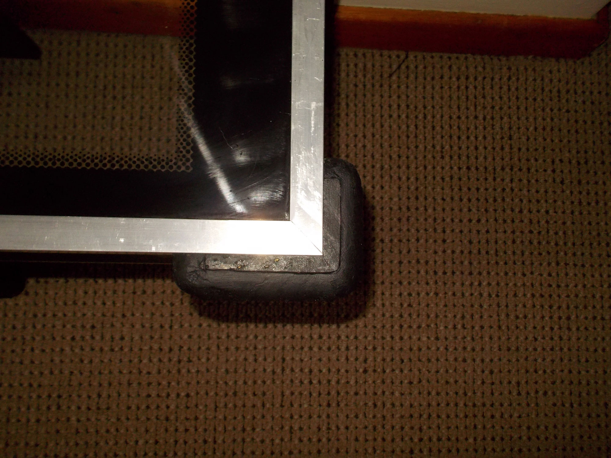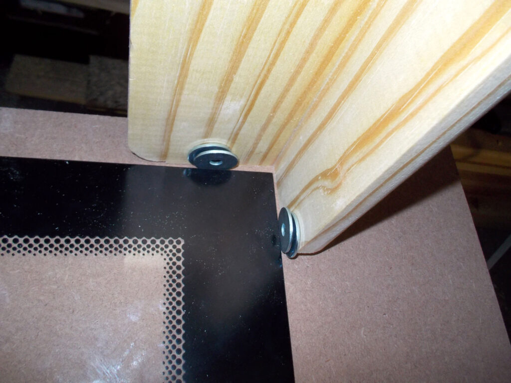 In order to set the legs to the correct spacing, I used a couple of washers on each edge of the glass, as shown here, and on all four corners, to set the length and width. It is important that there be a small amount of ‘play ‘between the glass panel and the aluminium frame; if there is none, or too little, you could find that the glass panel will not be able to fit within the legs, and hence the frame will not either. Or in forcing it, you will crack the glass and say some naughty words.