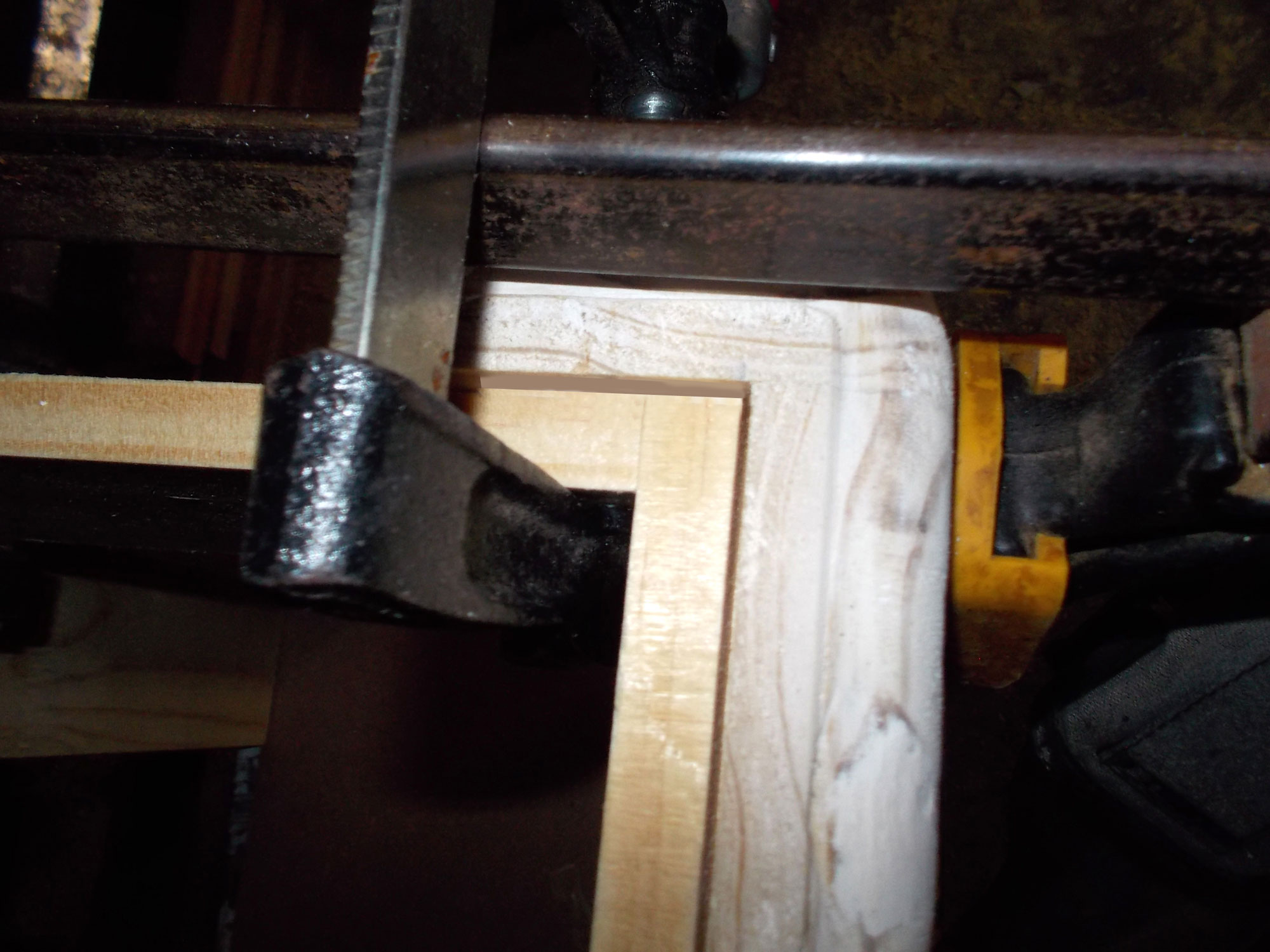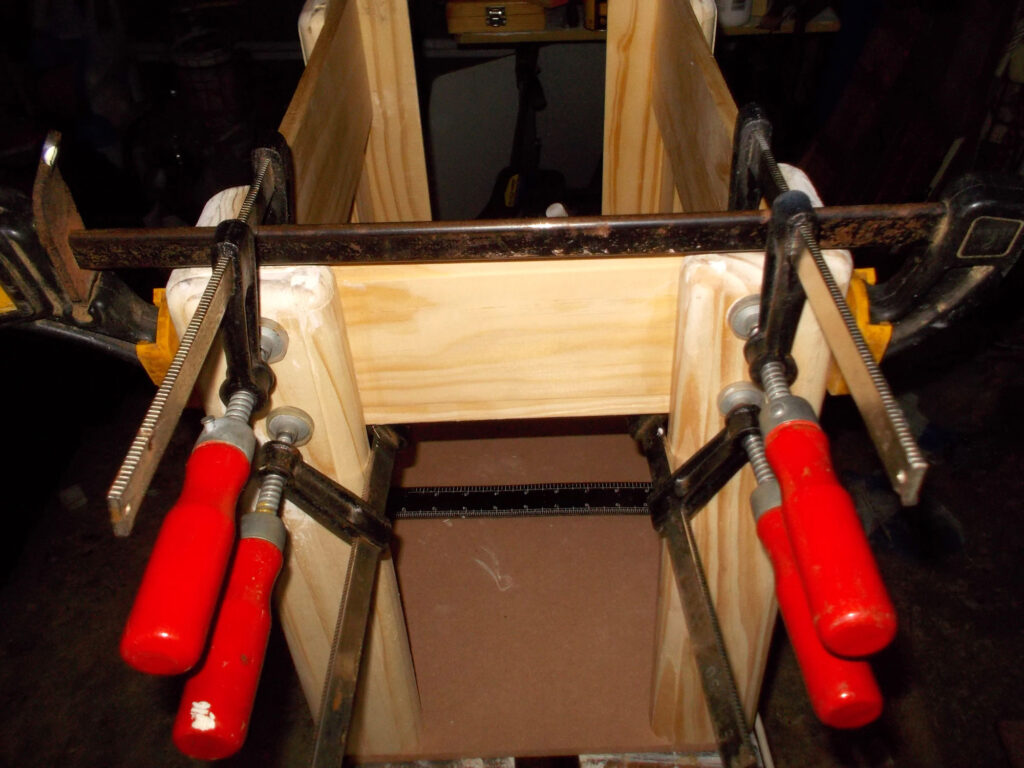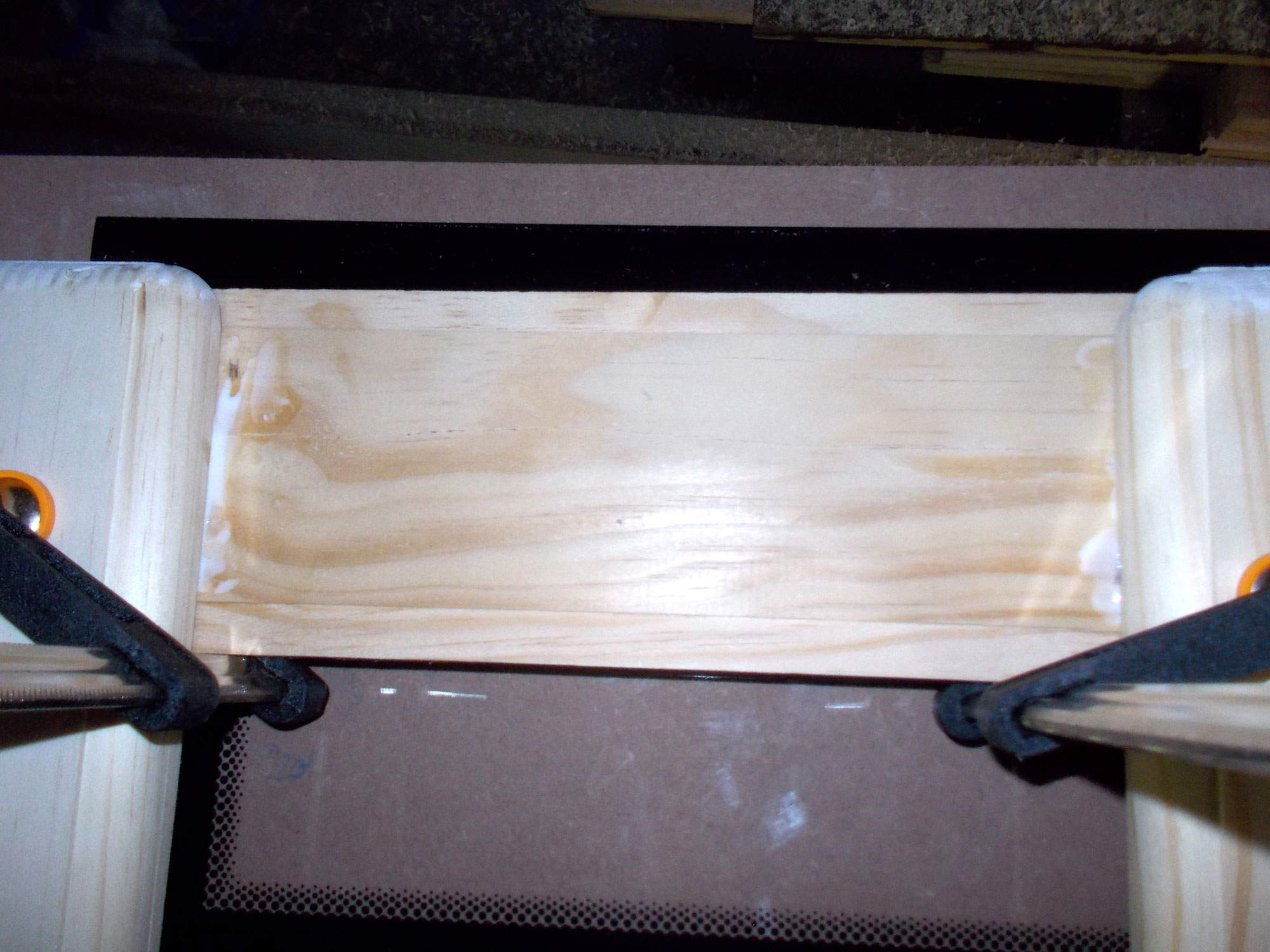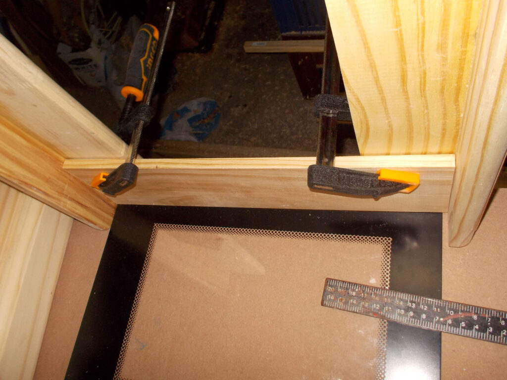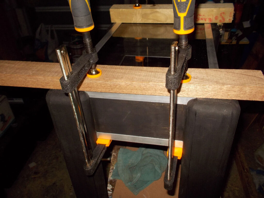 Apply glue and clamp them into position… note that they rest on the glass panel, as the sides have to allow the panel to sit properly on the legs. Apply the glue in an adequate amount, but sparingly towards the recesses as any glue oozing out into them and setting, with tend to block the recess you took so much time and effort to get right.