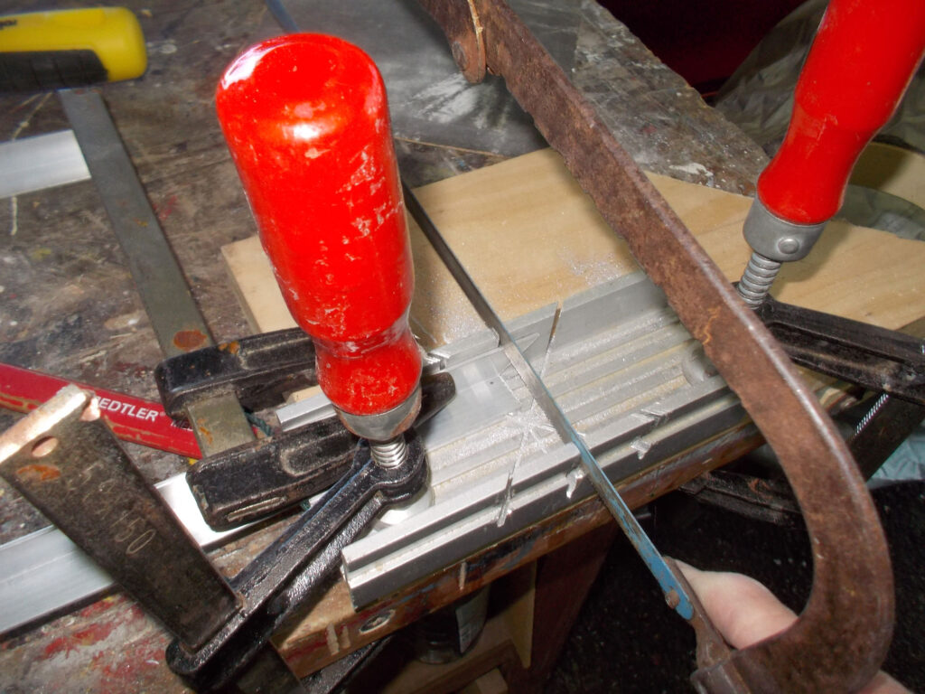 I used a hacksaw and mitre box to cut the various pieces of aluminium to length. Note that I mitred the top frame, but squared off the pieces for the sides’ underside trim. There’s no particular reason for that other than to show the two effects and the fact that mitred corners look rather cool – well, I think so!