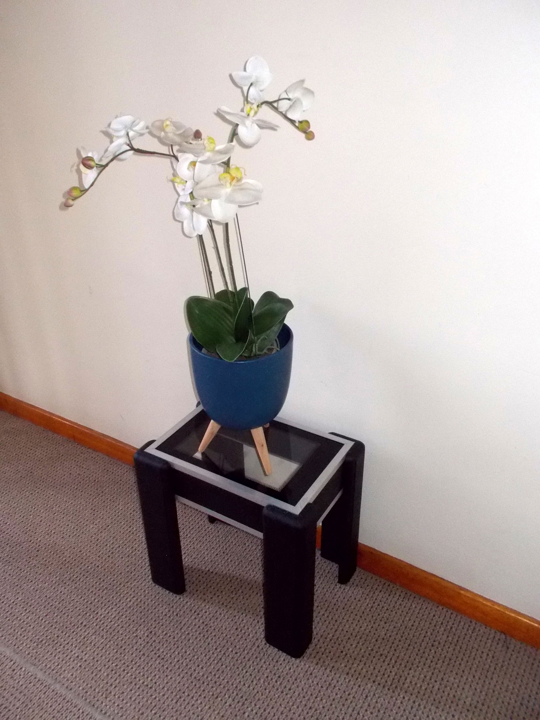 Apart from serving as a side table for that mug of coffee or glass of wine, this small table makes a rather nice stand for a pot plant – in this case an ornamental (replica) orchid.