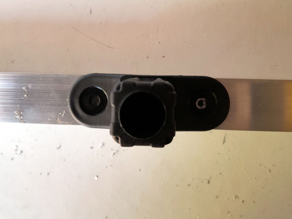 - First of all, I checked that the 12×16 securing screws would fit – i.e., not meet – when used to secure the braces; naturally, the braces would have to align perfectly for the stand to accept a round tray. As you can see, the screws will not meet. If you find that you use a different screw size and/or different square-section aluminium, and the screws you are using do just meet, the solution, when securing the braces, is to follow the same procedure as detailed below, drive one screw in through each pilot hole to establish a thread. Then remove it, and nip off the tip, so you can still insert the screw into the pilot hole, but the tips do not meet in the middle.