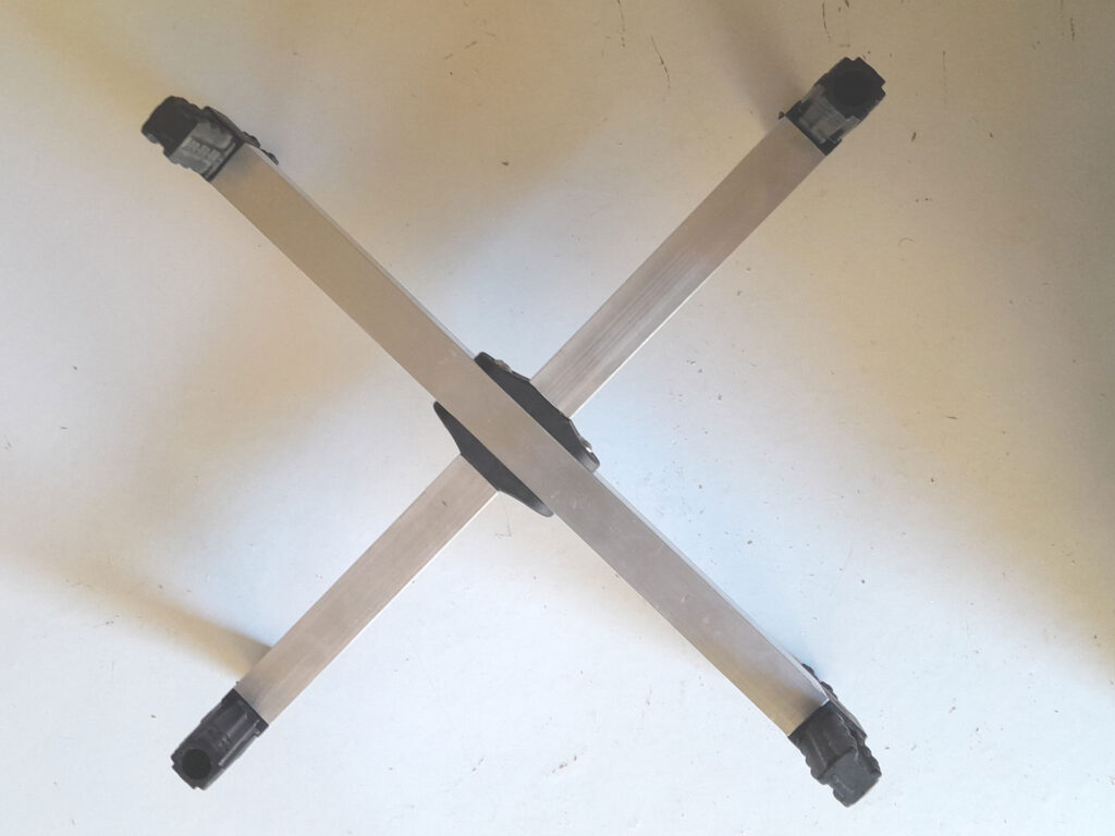 - One of the cross arm assemblies complete… looking rather like a four-prop drone main frame.