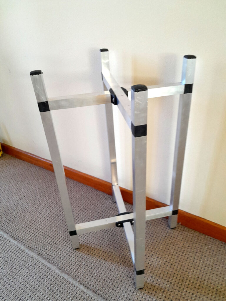 - I then completed the assembly and tapped in the end caps. Then I used a utility knife to remove any little bits of the connectors and end caps material shaved off during the seating process. Note: When assembling the stand, if you attach the legs to each cross arm assembly and then seat them, you must ensure that you keep the seating lengths as even as possible, tapping them down in rotation, because if you seat one side completely and its matching mate on the other side is not, you stand the risk of either bending the aluminium and/or causing the connectors to over-flex.