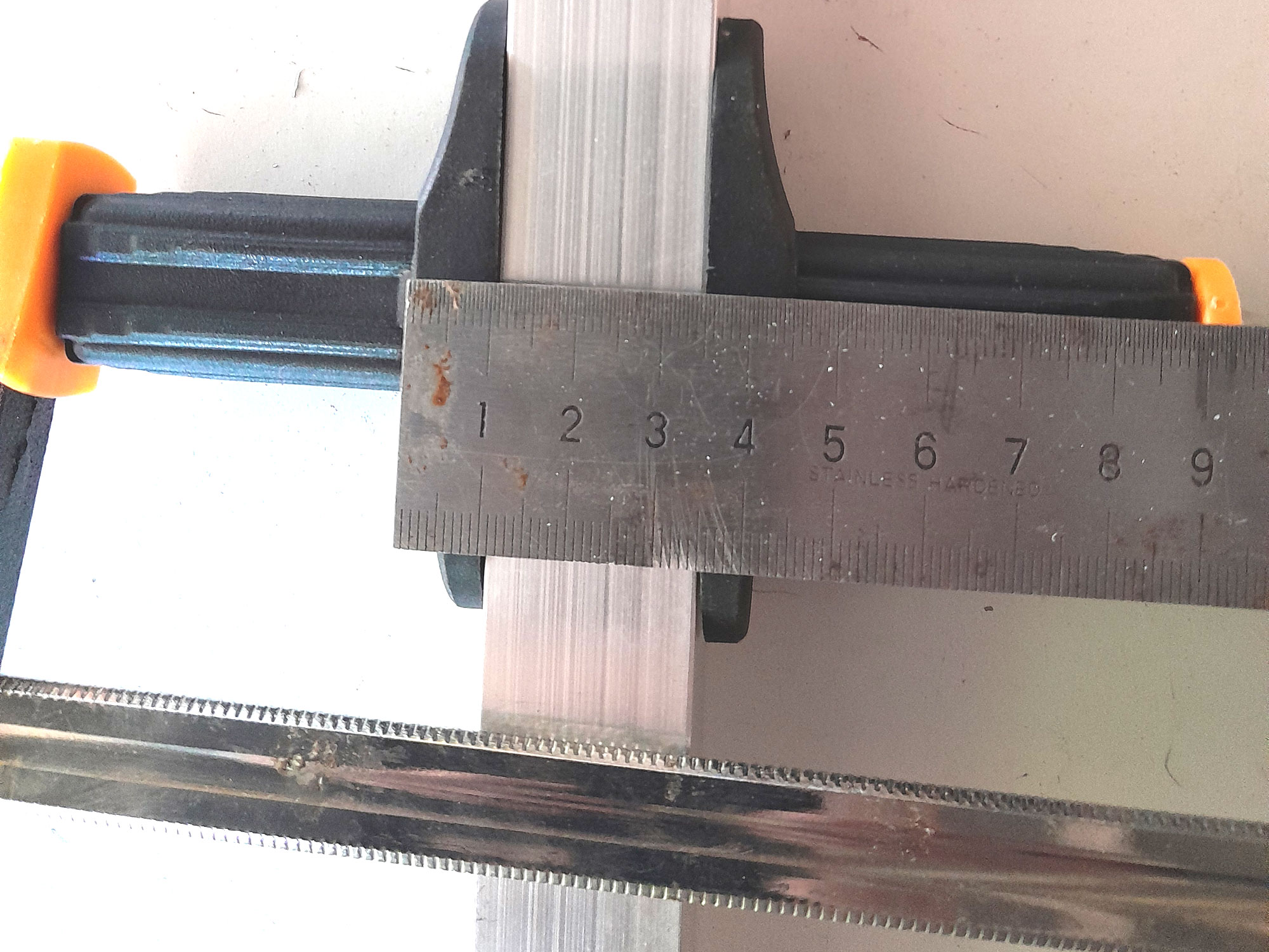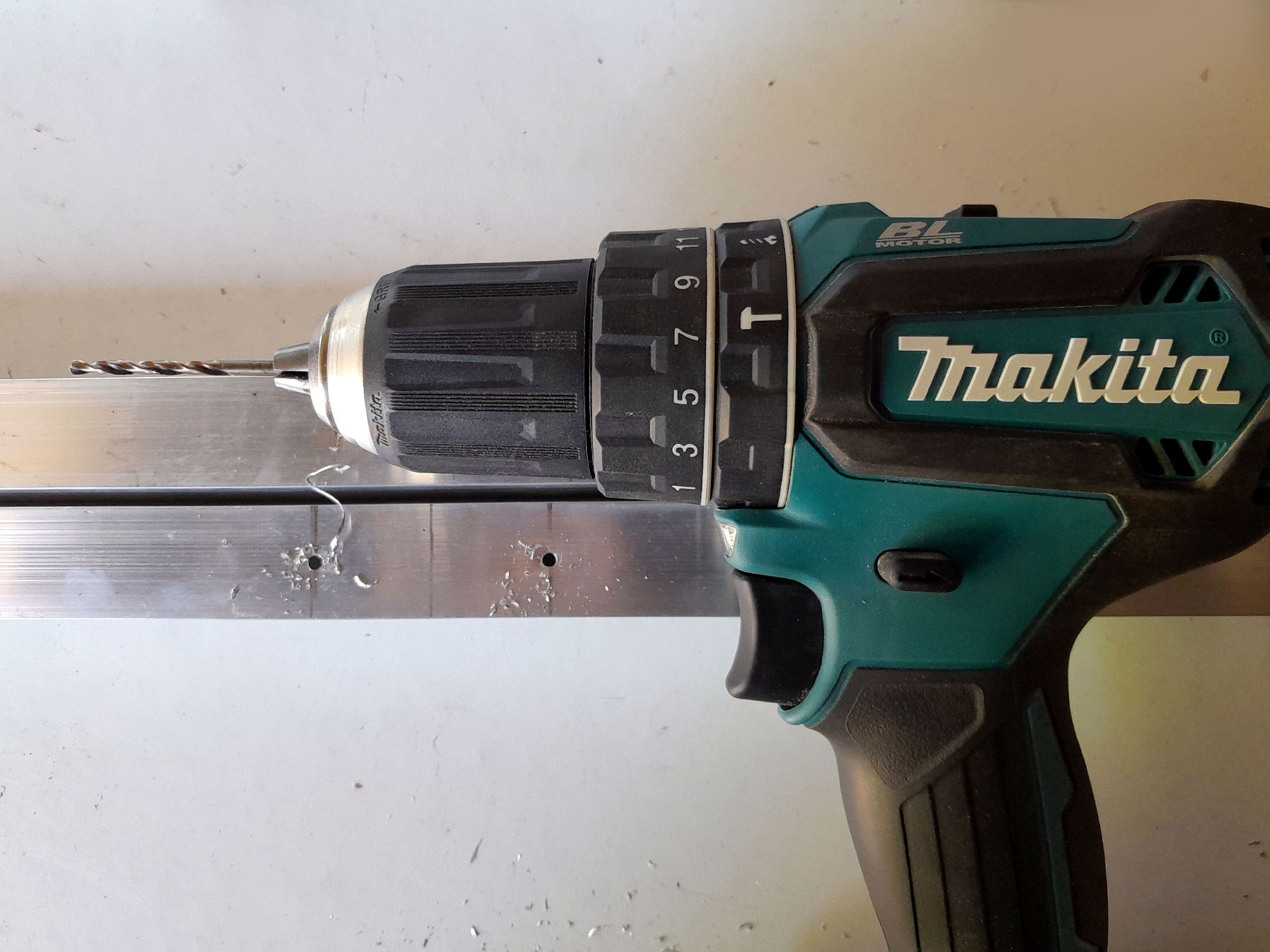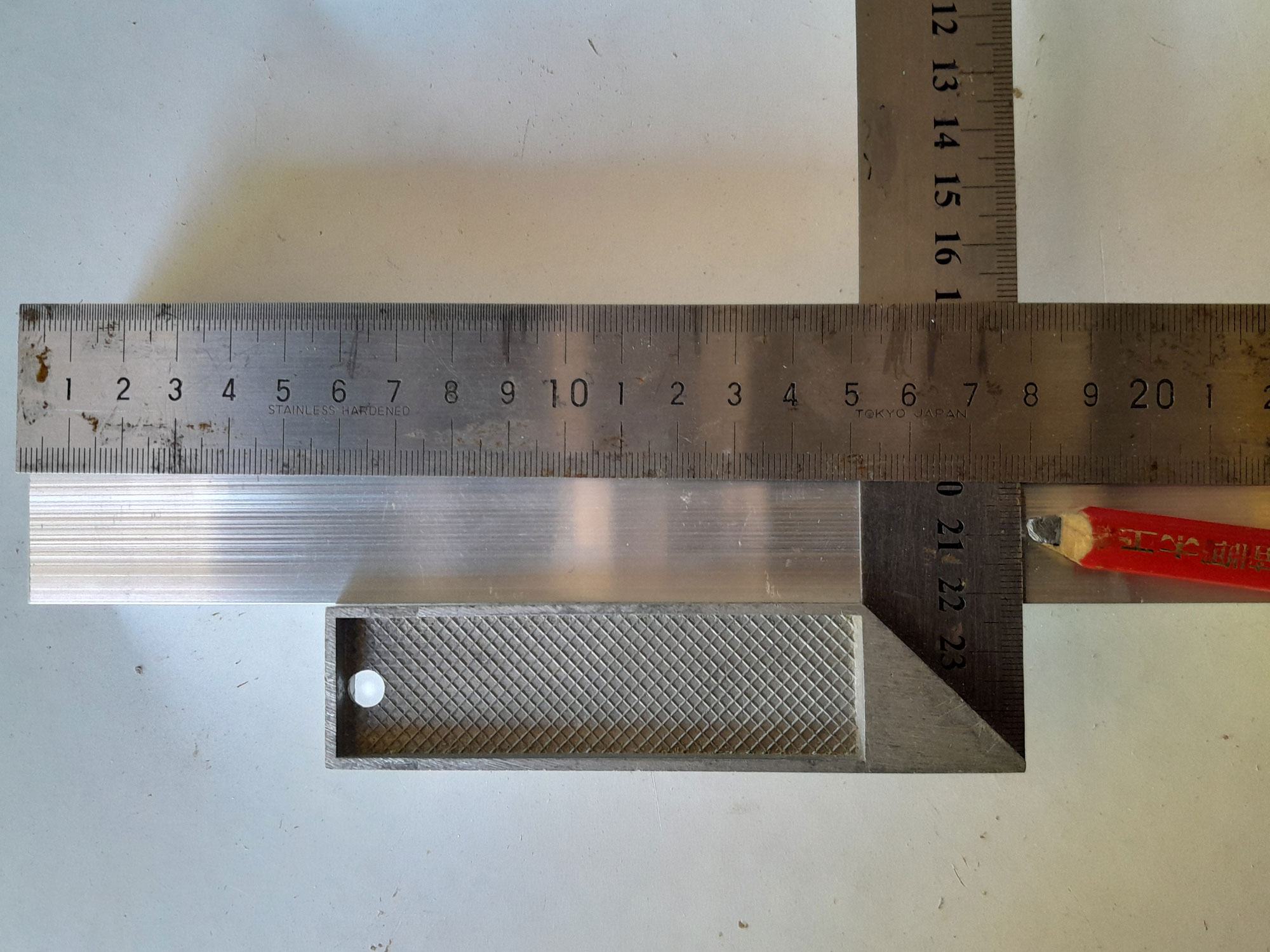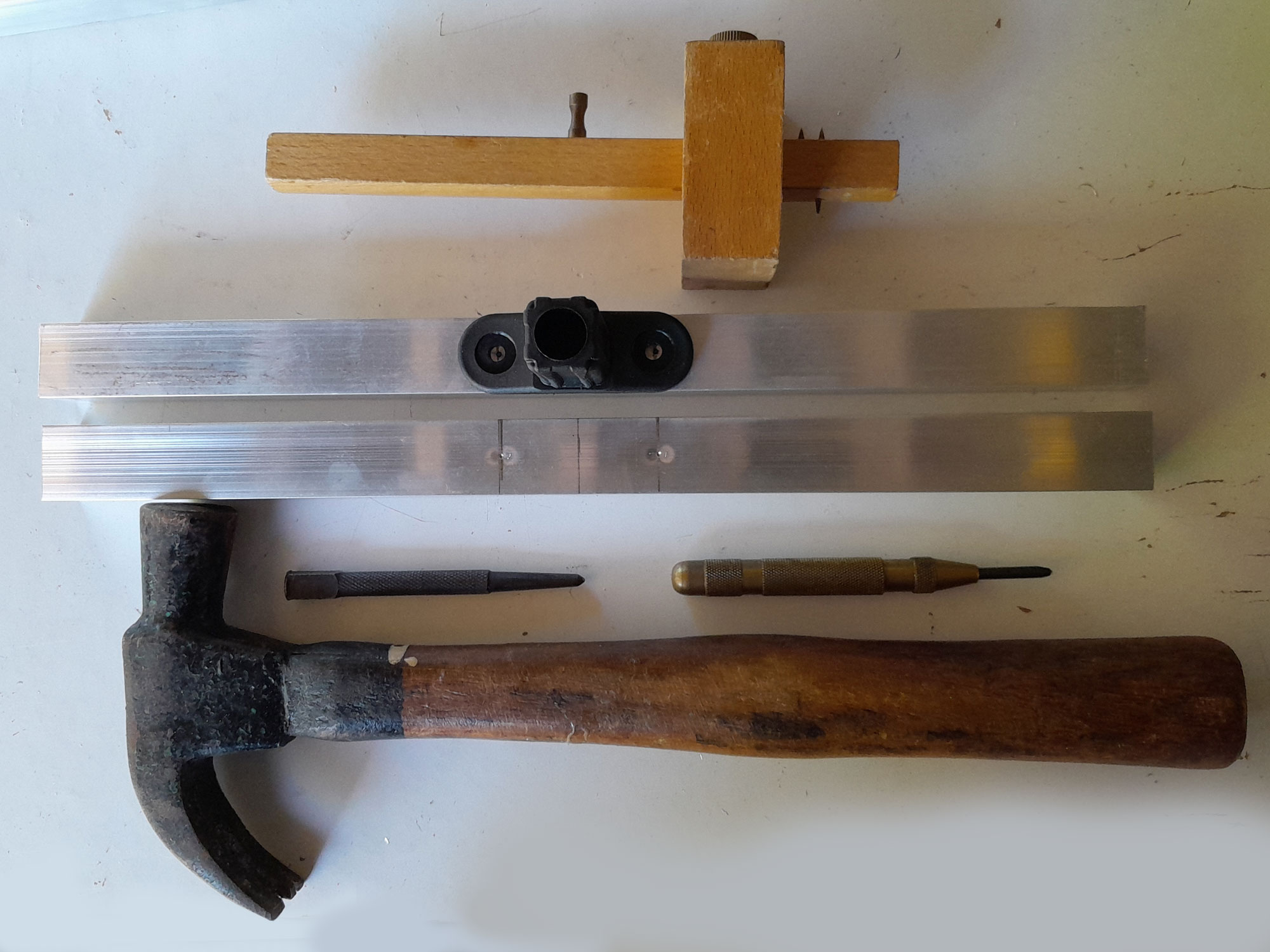 Drill/driver (mains or cordless), 4mmØ drill bit, hacksaw, jigsaw fitted with metal-cutting blade, or circular saw/mitre saw fitted with a blade for cutting aluminium, centre punch and hammer, or spring-loaded centre punch, gauge, wooden mallet and/or bar clamp.