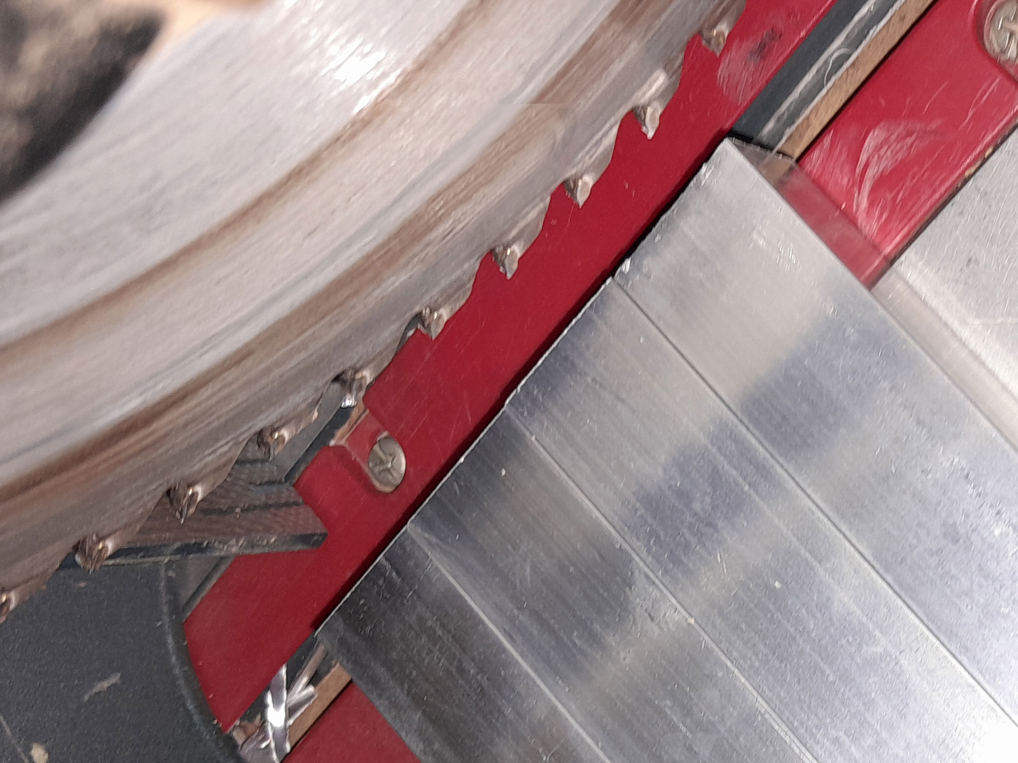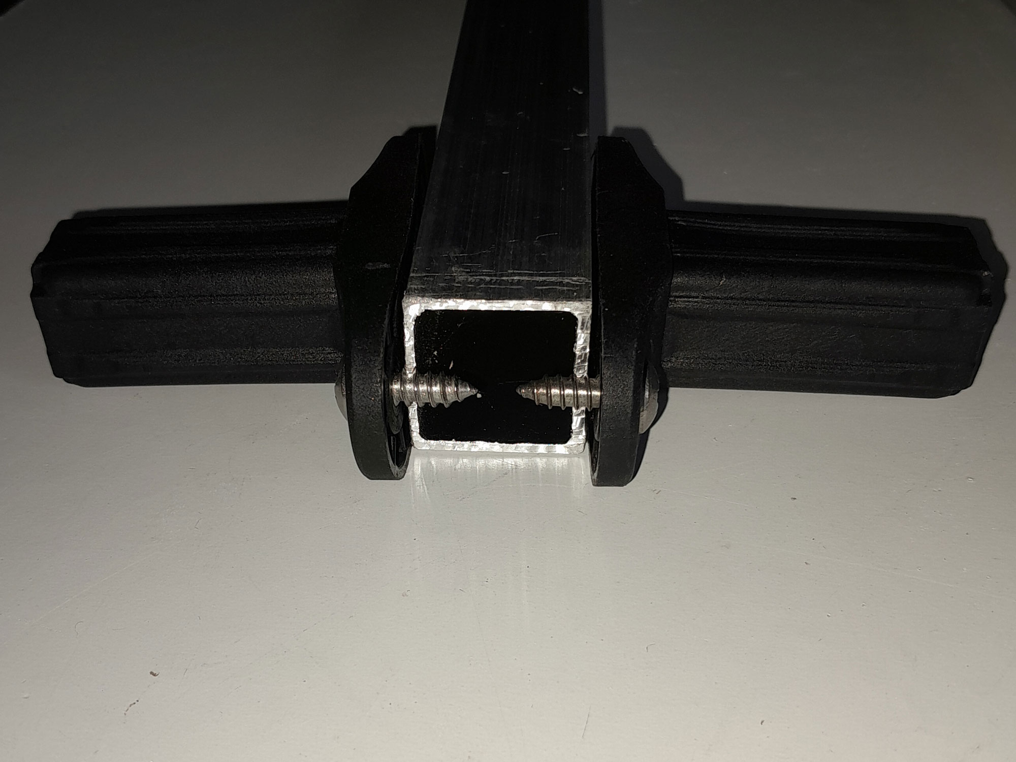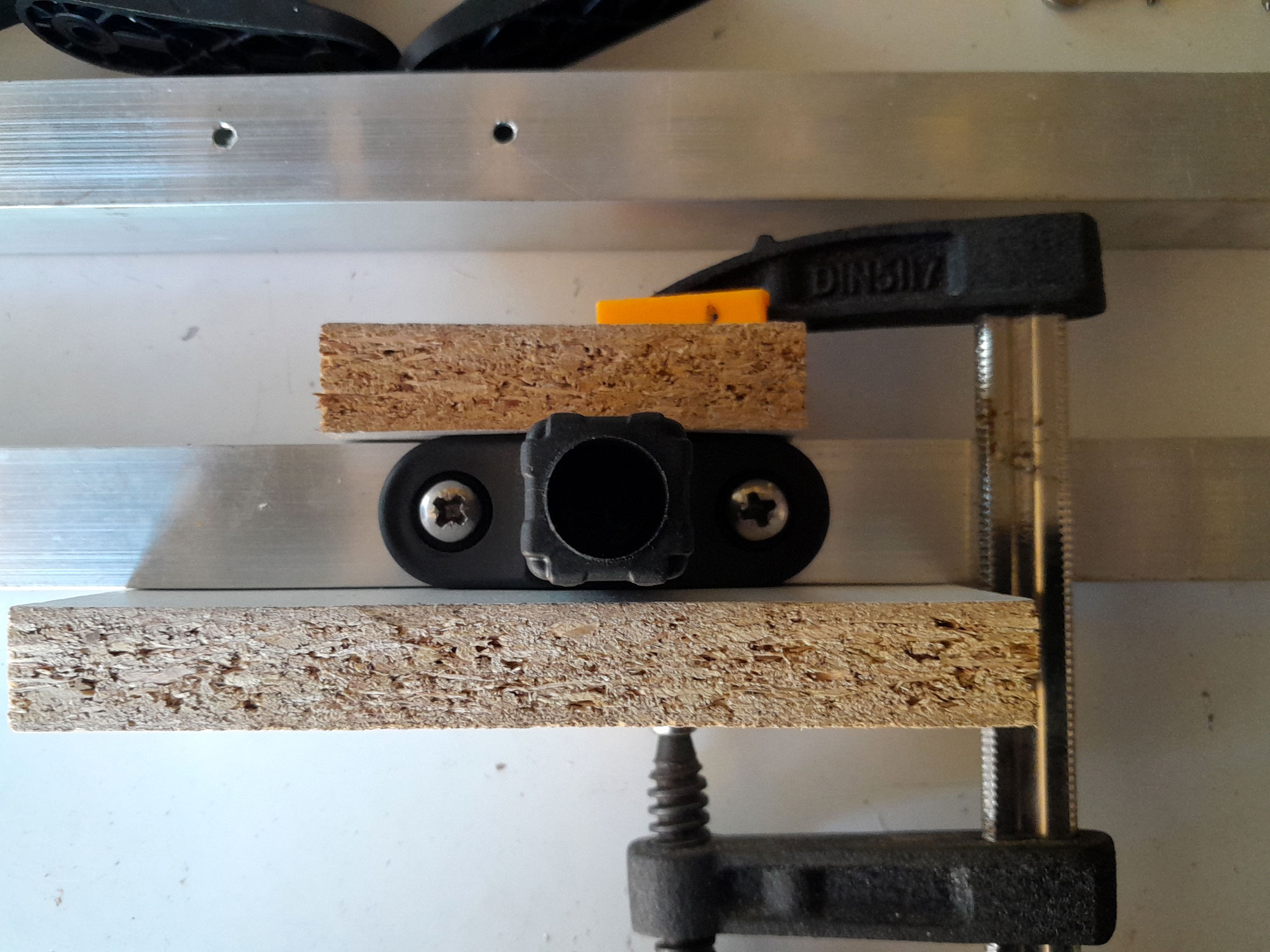 - First of all, I checked that the 12×16 securing screws would fit – i.e., not meet – when used to secure the braces; naturally, the braces would have to align perfectly for the stand to accept a round tray. As you can see, the screws will not meet. If you find that you use a different screw size and/or different square-section aluminium, and the screws you are using do just meet, the solution, when securing the braces, is to follow the same procedure as detailed below, drive one screw in through each pilot hole to establish a thread. Then remove it, and nip off the tip, so you can still insert the screw into the pilot hole, but the tips do not meet in the middle.