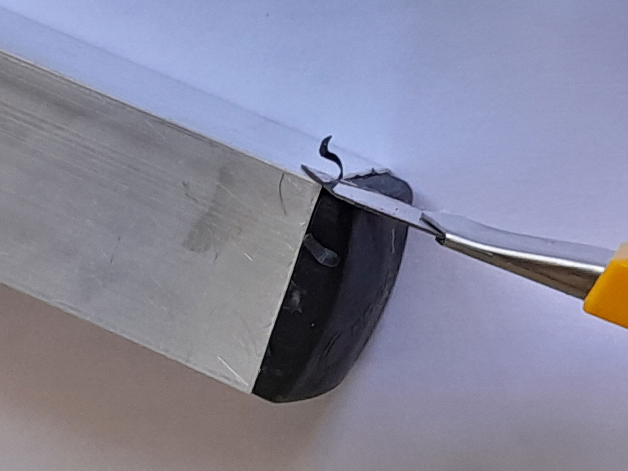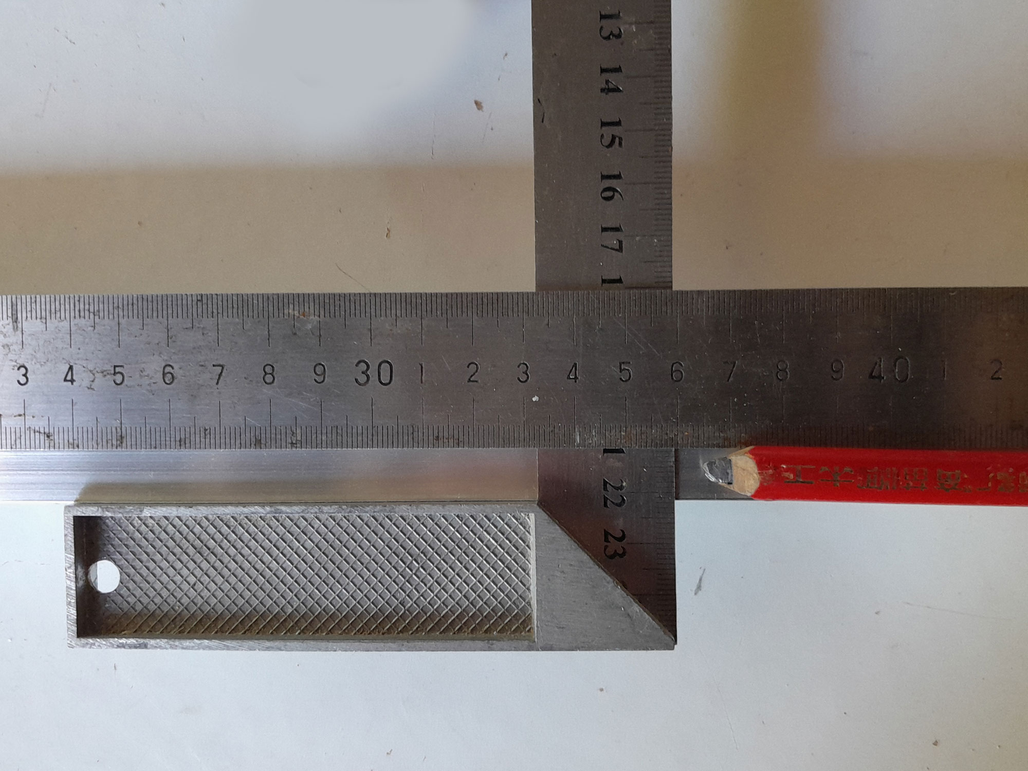 - Just before securing the braces in position, and using a piece of scrap aluminium, I confirmed the 4mmØ pilot hole was the correct size.