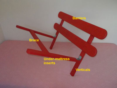 Here it is in position and keeping the sleeper safe from rolling out of bed. The verticals bear against the bed base ensures that the barrier will be adequately braced against flexing outwards, while the under-mattress inserts and their brace prevent it sliding out.