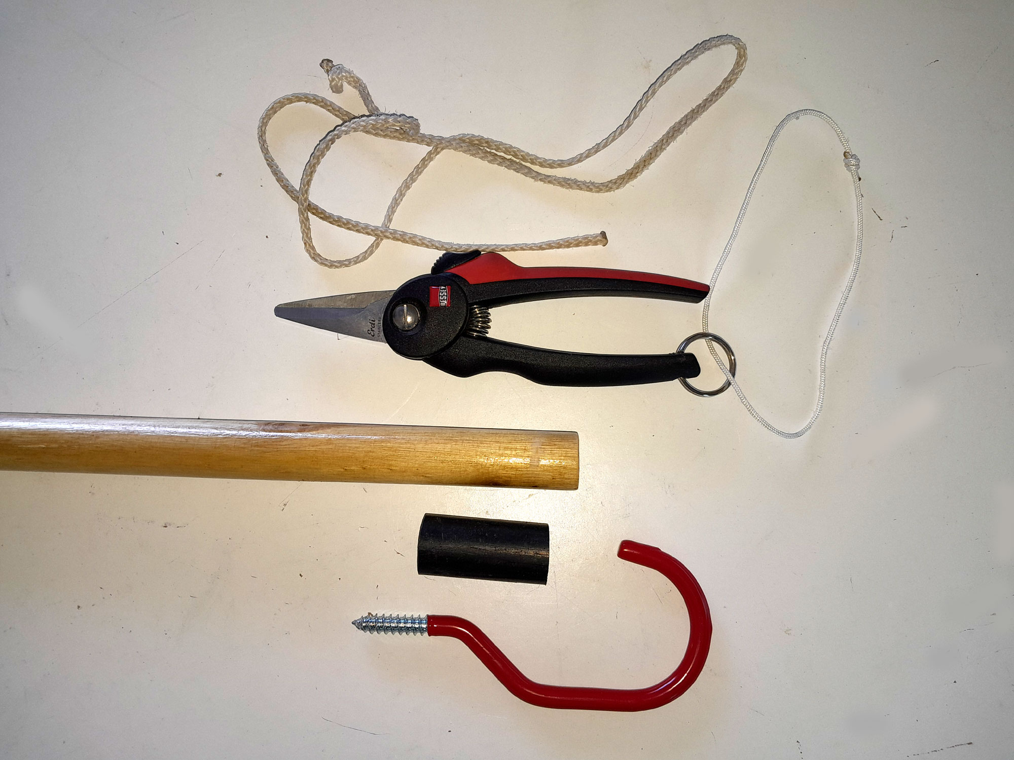 1. The hook requires a bare minimum of materials, and if you have an old broom or rake hanging around, and some cord and a bit of irrigation pipe, all you need to buy is the bicycle hook.
