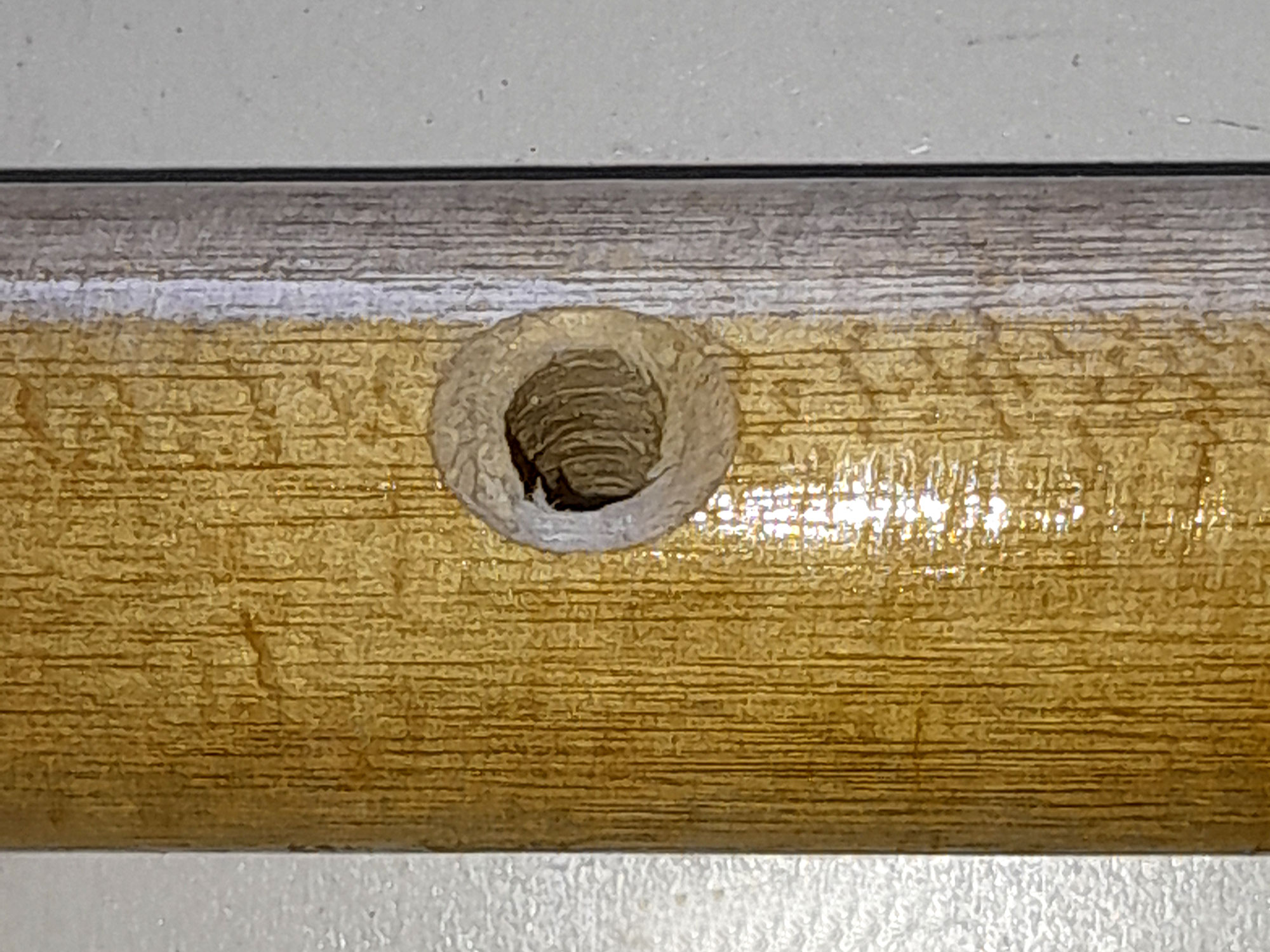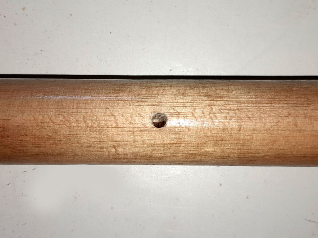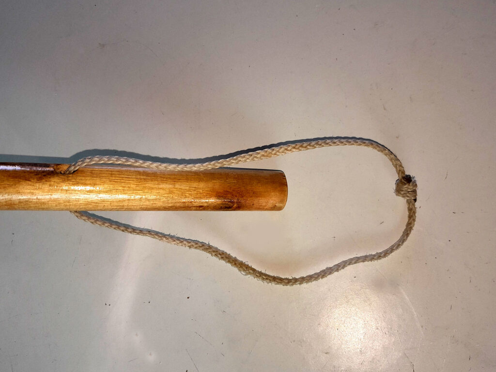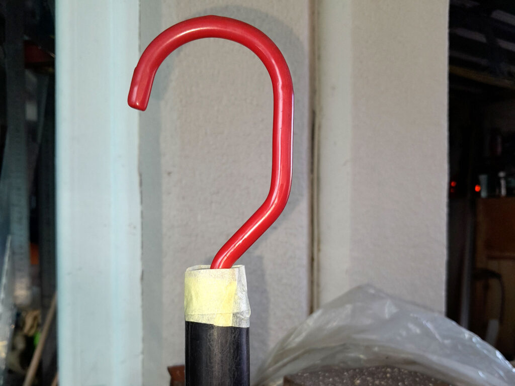 1. To finish off, I used a countersink bit to “round” off the sharp edges of the hole just drilled. I followed that up by applying a few coats of marine varnish to the entire pole, from the black-painted hook end to the hand end, ensuring that I got varnish right into the hole drilled for the cord. I hung it up again on its hook for a day or so until the last coast of varnish was completely dry. Then I cut my cord to length, seared the ends to seal them, and made my hand loop. This is not essential, but it does make it less likely that you will drop your happy hooker into the pool.