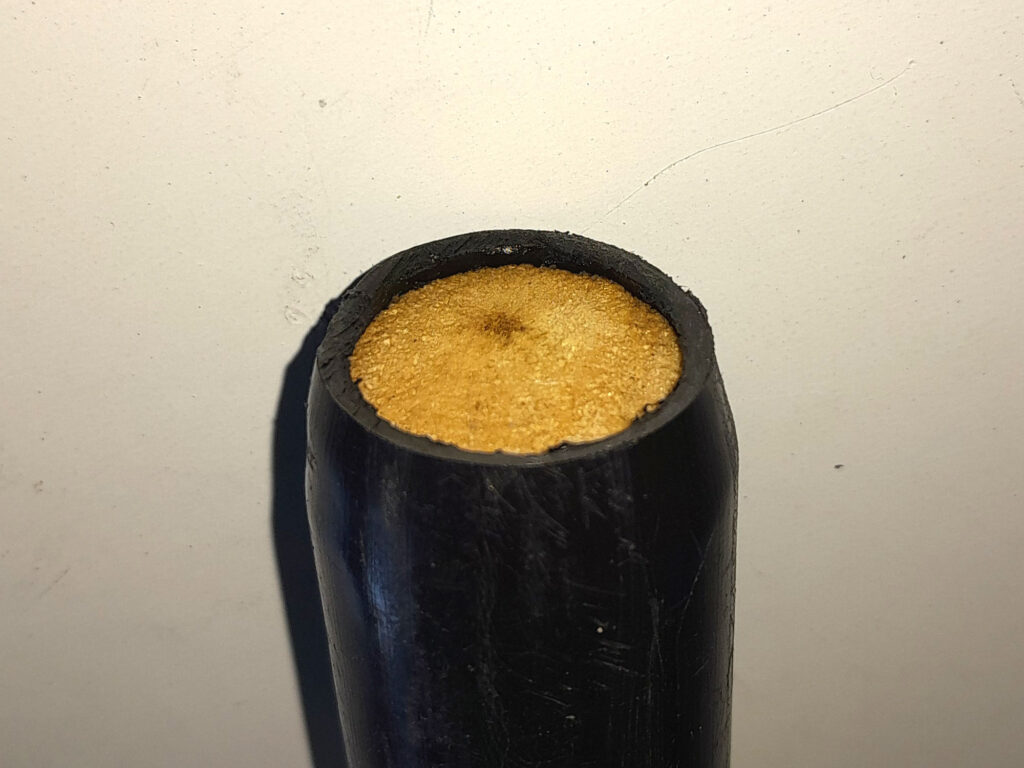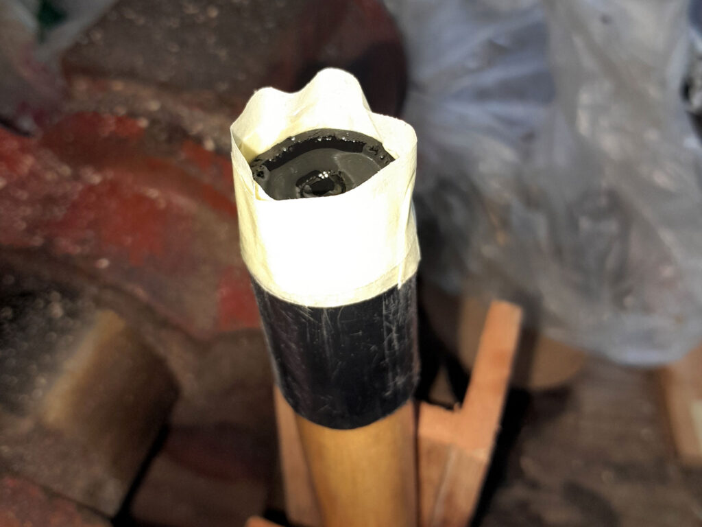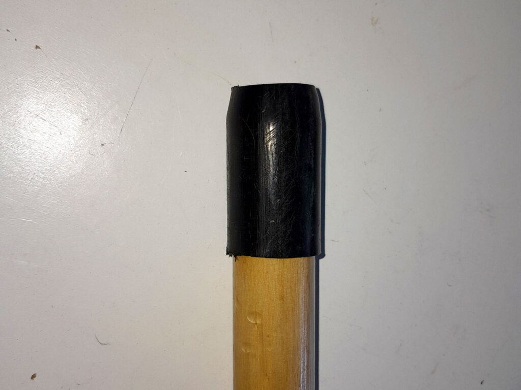 3. Then with some effort, plus some naughty four-letter words such as “darn”, “drat”, “gosh” and similar (I don’t know any other naughty four-letter words), you will be able to push the length of pipe over the end of the pole. I did this for two reasons; protect the end of the pole, and secondly, stop it splitting.