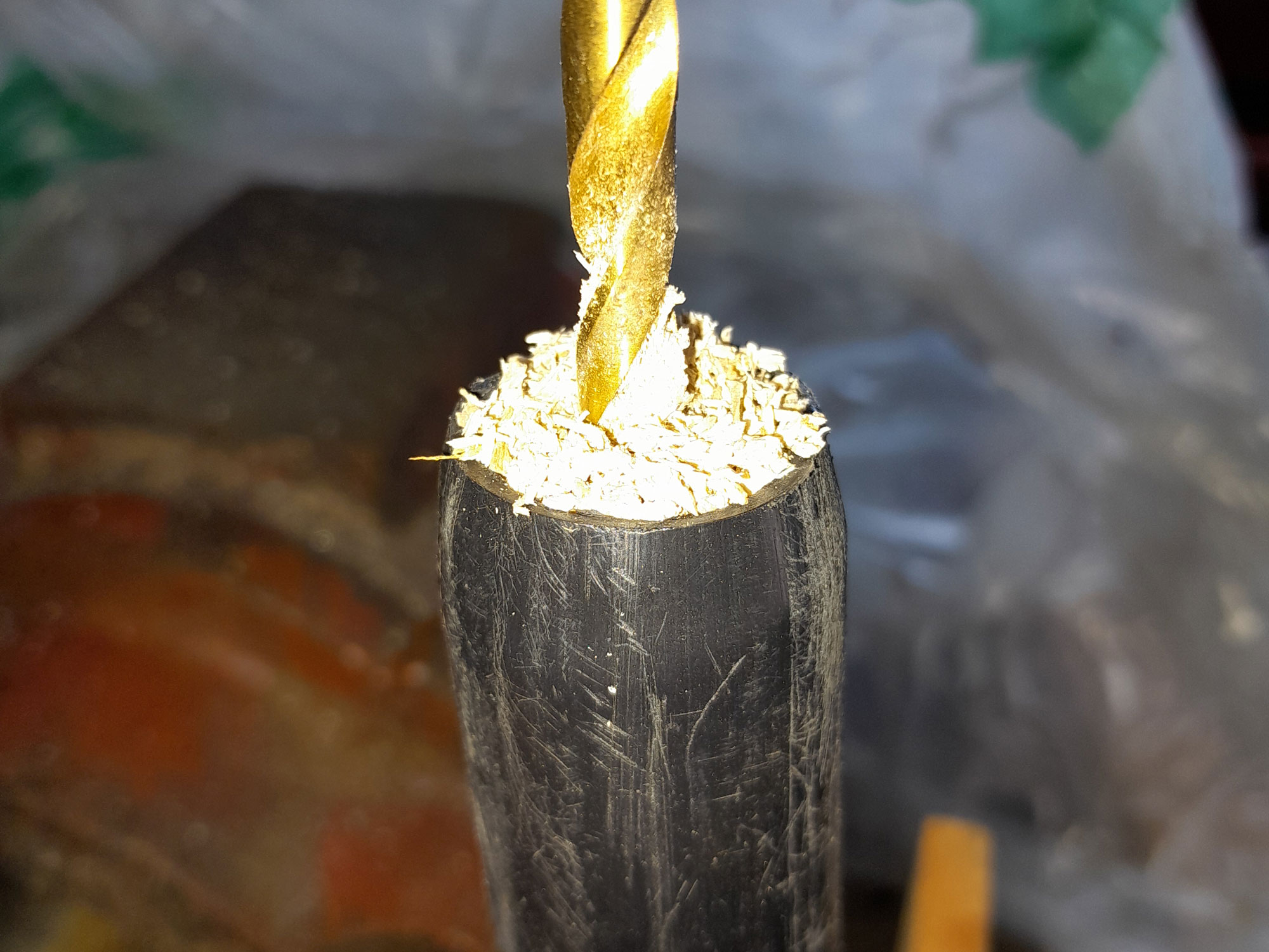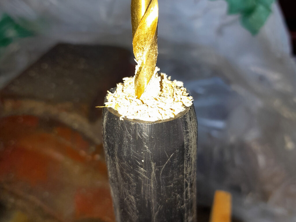 5. Now, to ensure that the screw end of the bicycle hook would not split the pole, I drilled a 5mmØ hole into the centre of the end, about 25mm deep. (The threaded end of the hook is about 45mm or long.)
