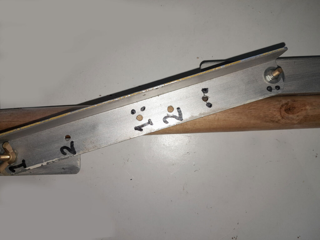 4. Then I used a centring device I made to drill a hole for a cord in the other end of the pole, about 100mm in from the end.